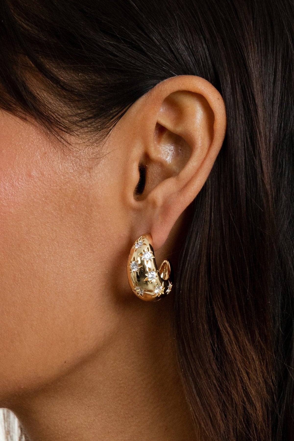 These Celeste Hoops by Miranda Frye are celestial perfection. Chunky yet lightweight, they are engraved with starry motifs that add dreamy dimension to their polished gold finish — a luxurious statement for day or night.