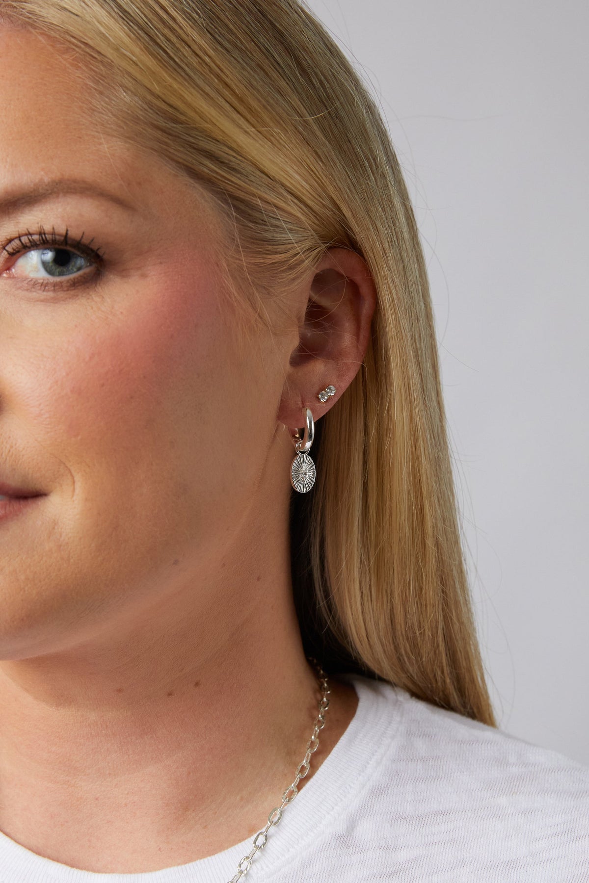 These Amanda Huggies by Miranda Frye (Silver Finish) deliver styling versatility with a removable charm feature. Sleek, sculptural, and part of the Kate Bryan Collection, they offer elegance and edge in one refined piece.
