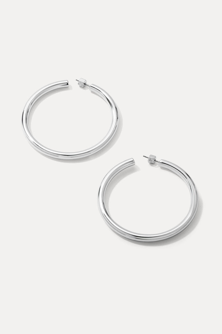 Sterling silver-plated brass with surgical stainless steel posts. Diameter: 55mm; Thickness: 5mm.