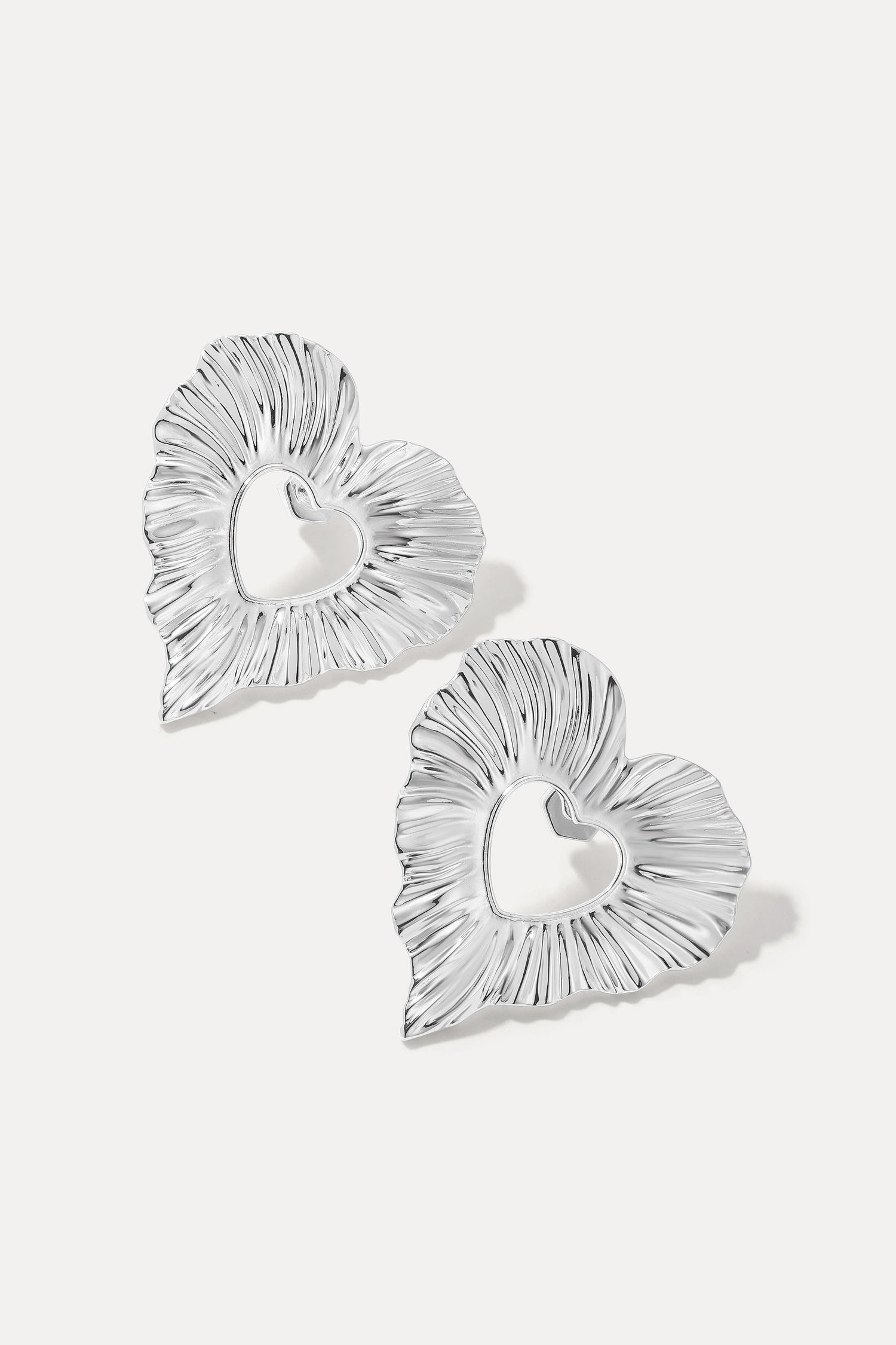 Sterling silver-plated brass with surgical steel posts and custom MF earring backs. Measures 33mm height, 31mm width.