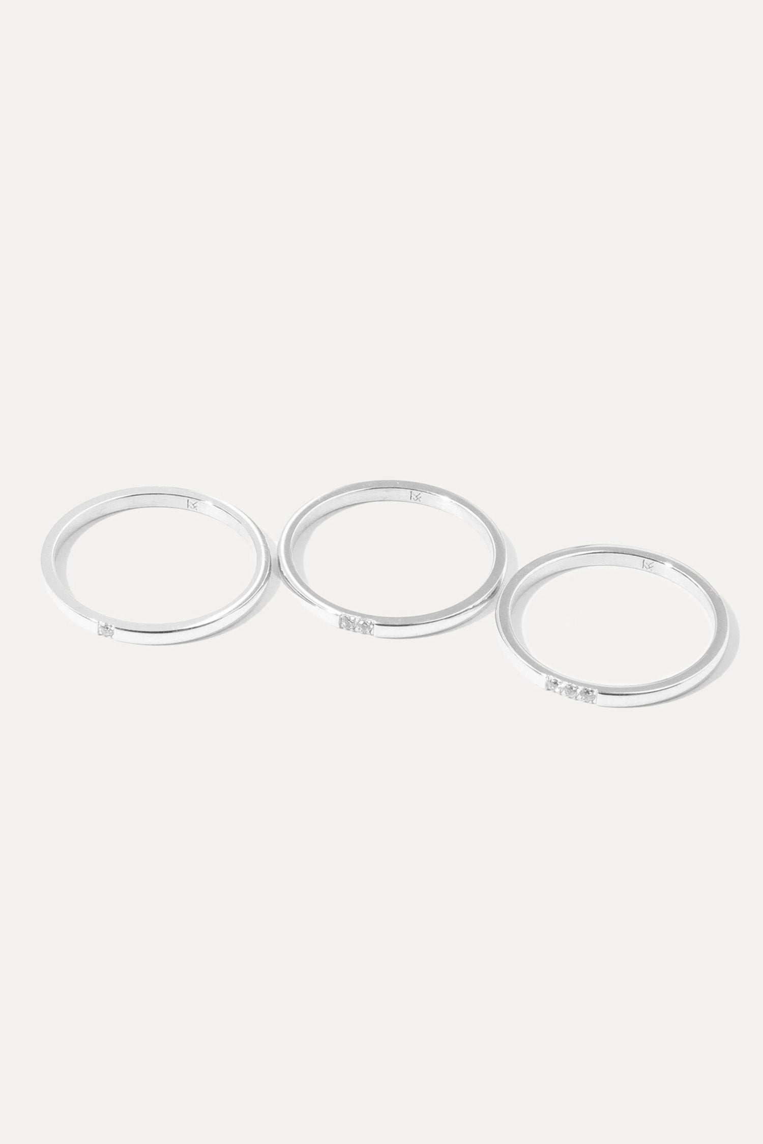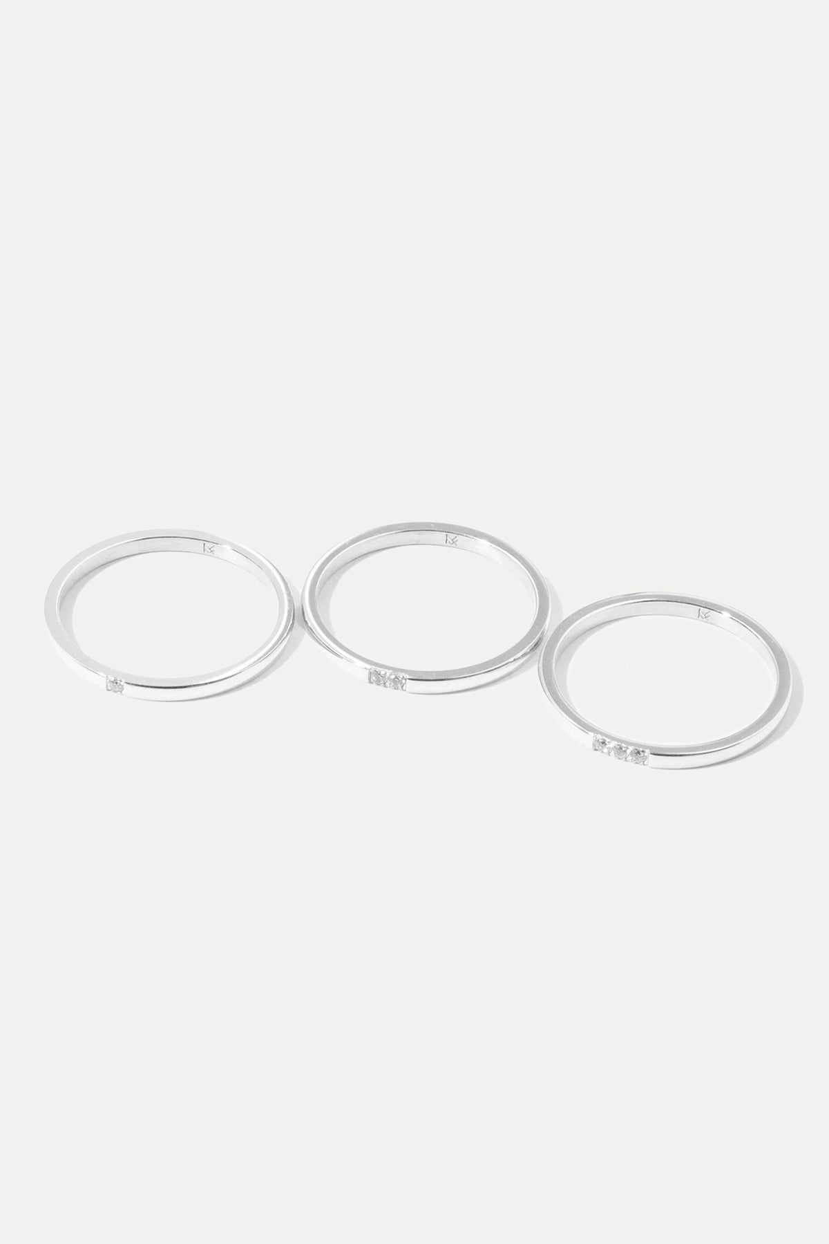 Set of 3 rings in sterling silver-plated brass, 1.5mm bands with 1mm cubic zirconias.