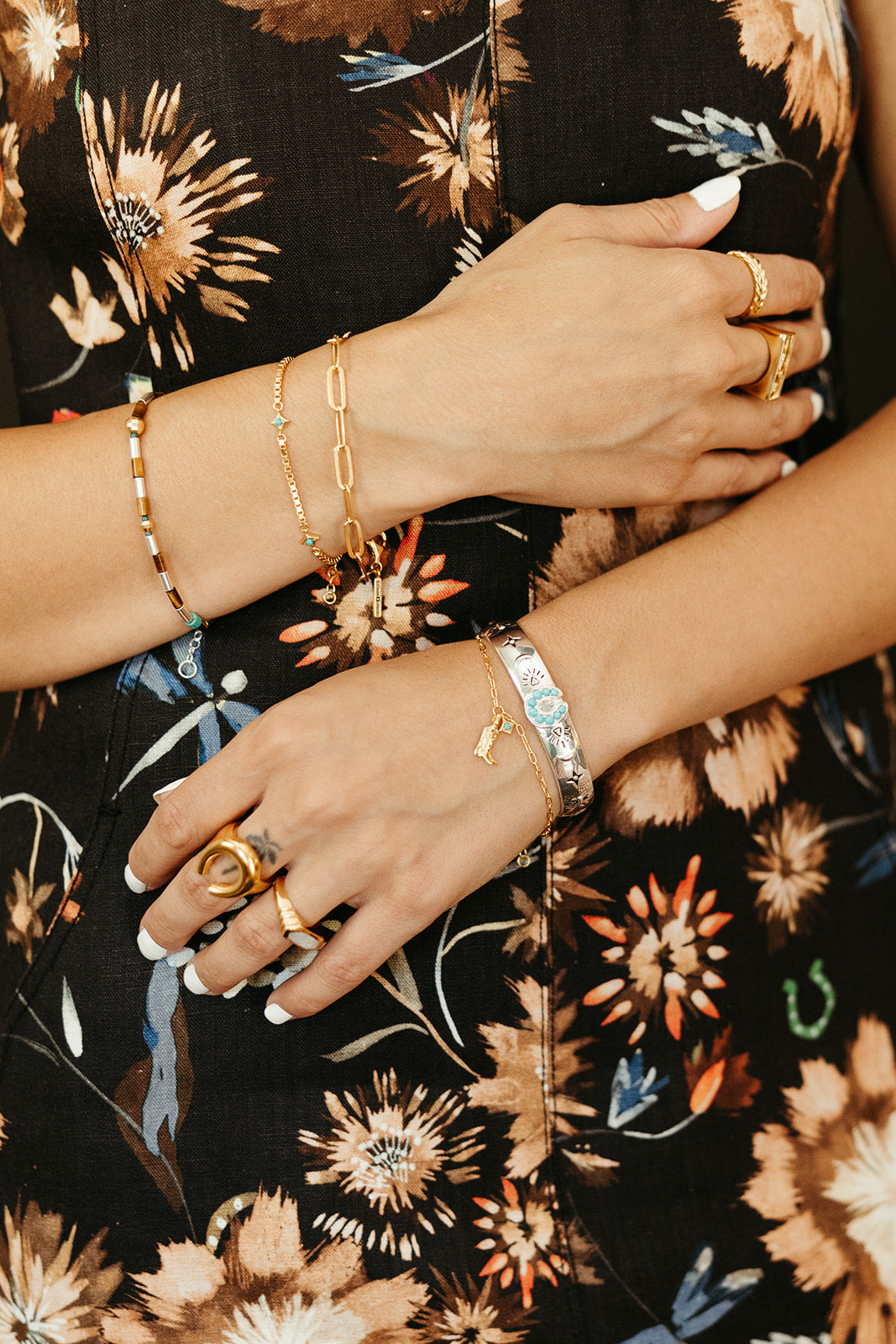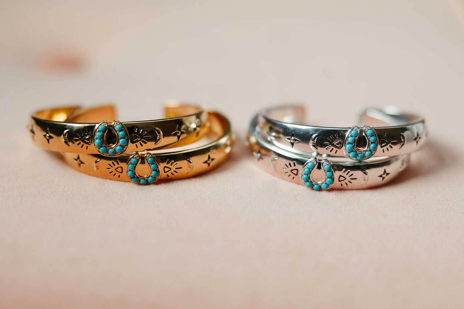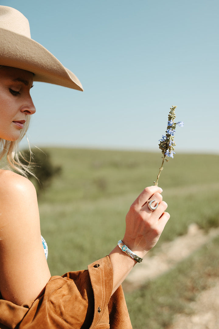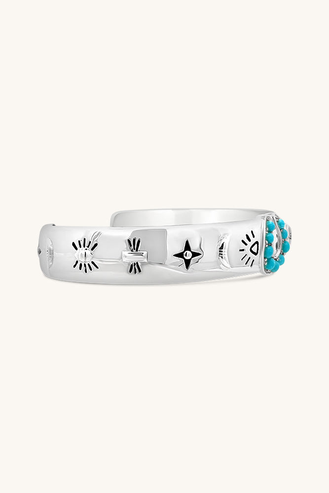 This Lucky Stars Cuff Bracelet - Silver by Sierra Winter Jewelry is a talismanic tribute to optimism and the magic of western charm. Bold yet heartfelt, the thick sterling silver cuff is engraved with “Count Your Lucky Stars” — a daily reminder to stay grateful and grounded. A turquoise horseshoe centerpiece anchors the piece, surrounded by carefully etched symbols of luck and protection. With its timeless western influence, this statement cuff is a wearable heirloom imbued with intention.