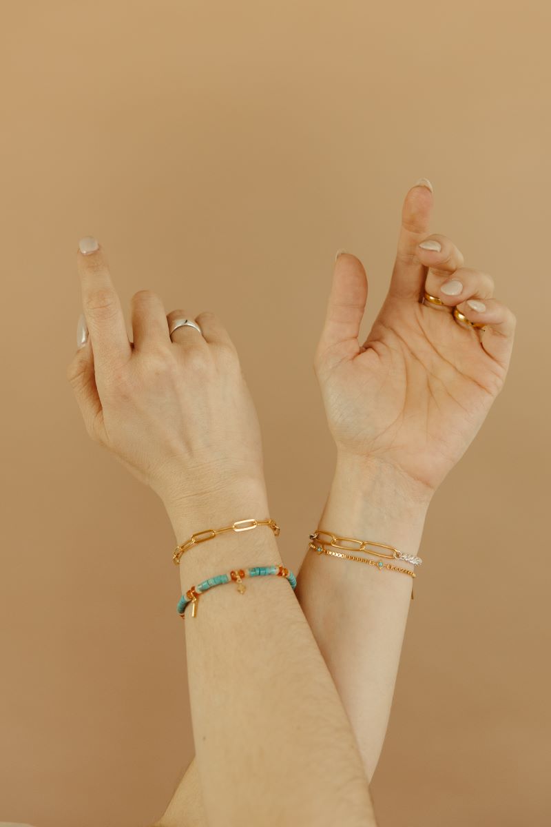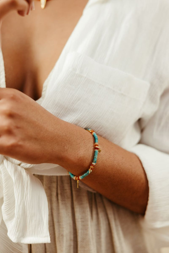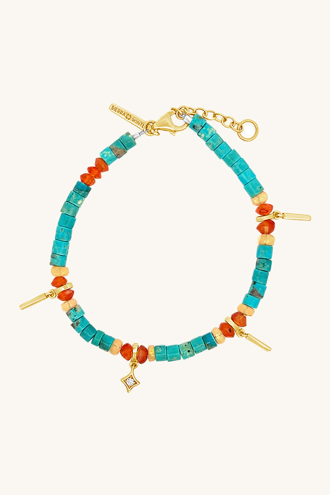 The Cantina Bracelet by Sierra Winter Jewelry captures the carefree joy of a perfect day by the sea. Inspired by beachside music and margaritas, this colorful bracelet combines turquoise, opal, and carnelian beads into a festive rhythm that feels ready to dance. With its 18k gold vermeil accents and mood-lifting palette, it’s the kind of piece that turns any stack into a party.