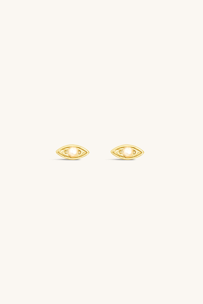 The Evil Eye Stud Earrings - Pearl by Sierra Winter Jewelry offer a classic, feminine twist on a powerful motif. Featuring June’s birthstone, the freshwater pearl, these gold vermeil studs channel purity and emotional wisdom while keeping your aura protected.