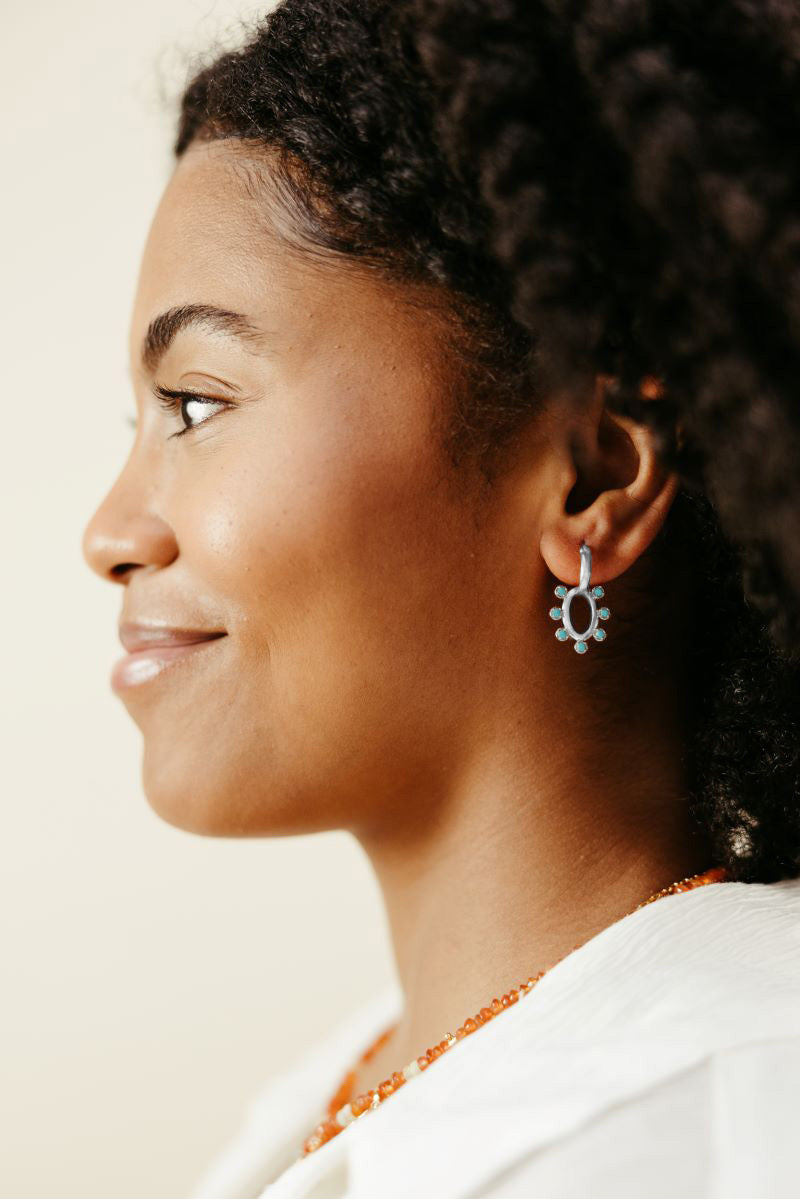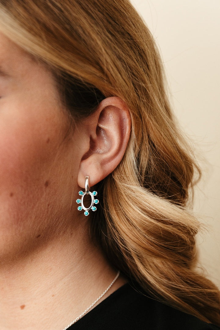 The Dolly Hoop Earrings - Turquoise (Silver) by Sierra Winter Jewelry serve western charm with a modern twist. With a splash of turquoise swinging from sterling silver hoops, these earrings are your new go-to for bold, effortless cool. Inspired by Dolly Parton and made to move with you.