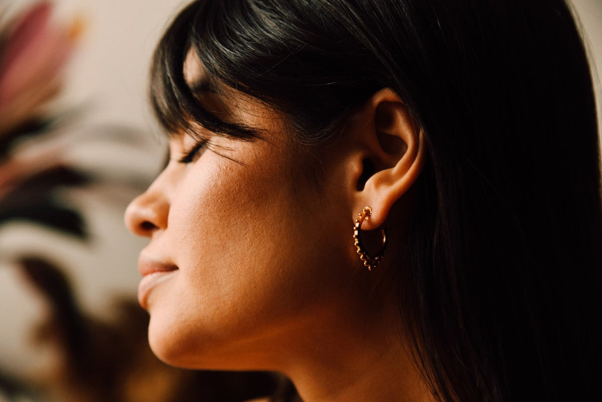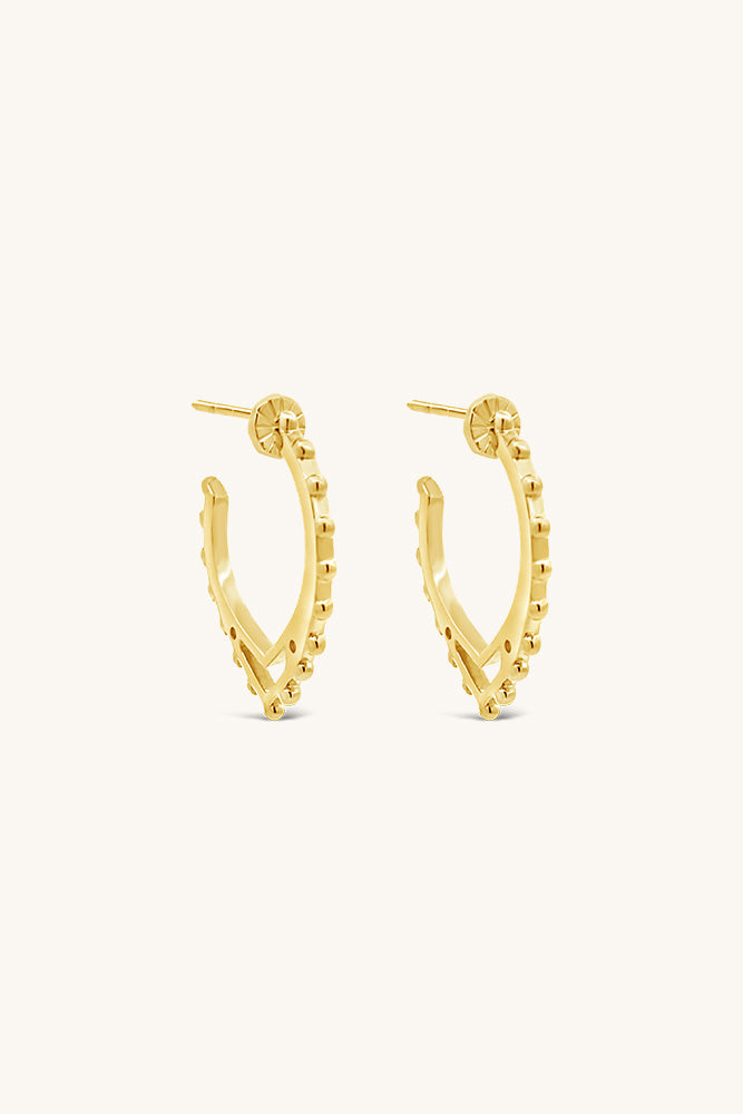 These Buffalo Mound Hoop Earrings - Gold by Sierra Winter Jewelry are textured tributes to a beloved childhood landmark. Inspired by a mysterious hill along I-70 in Kansas, these golden hoops are a personal story rendered in metal—bold, warm, and nostalgic. Ideal for adding texture and meaning to your everyday edit.