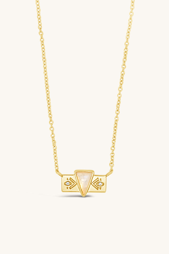 This Irid Necklace by Sierra Winter Jewelry is an ethereal layering piece featuring a glowing rainbow moonstone. With a soft luminescence and refined silhouette, it pairs beautifully with other necklaces while maintaining its own luminous charm. A delicate, dainty favorite for everyday radiance.