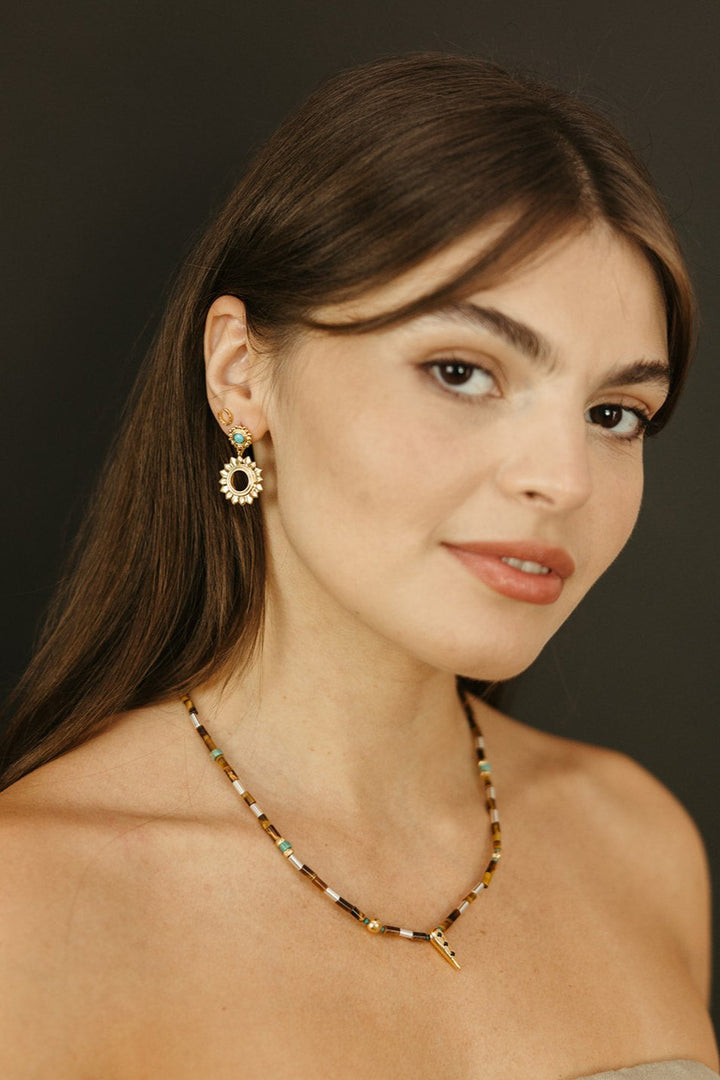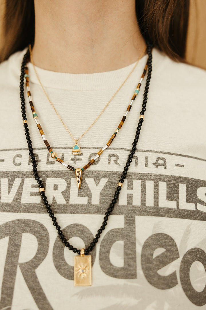 This Out West Necklace by Sierra Winter Jewelry channels a rugged, Western-inspired charm with luxe detail. Featuring earthy tiger’s eye, vibrant turquoise, and a mix of metals, this beaded necklace feels grounded in heritage and full of personality.