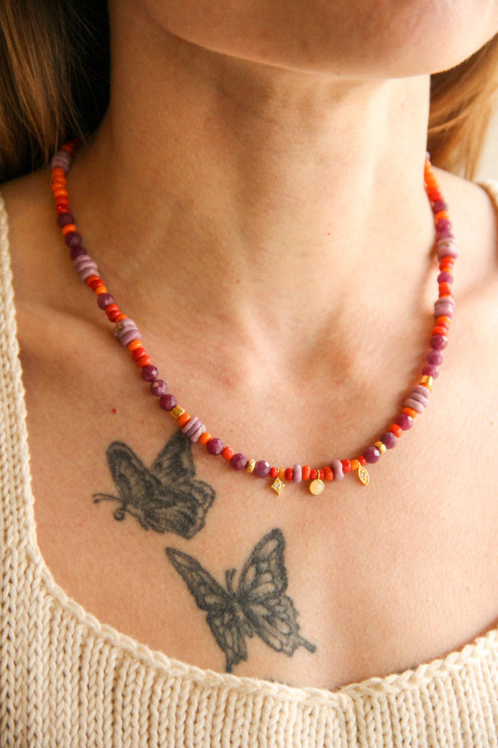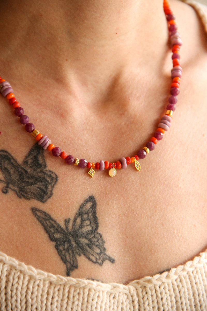 Handcrafted with ruby, phosphosiderite, white topaz, and 18k gold vermeil accents. 16–18' long. One of a kind.