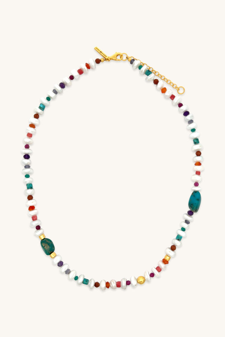 Features freshwater pearl, turquoise, goldstone, and mixed semi-precious gemstones with 18k gold vermeil. 17–19' long. One of a kind.