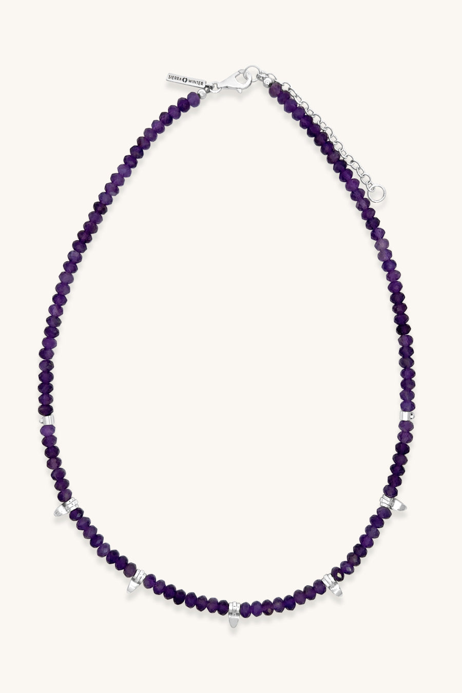 Handcrafted in sterling silver with semi-precious amethyst stones. Adjustable 16–18' length. One-of-a-kind.