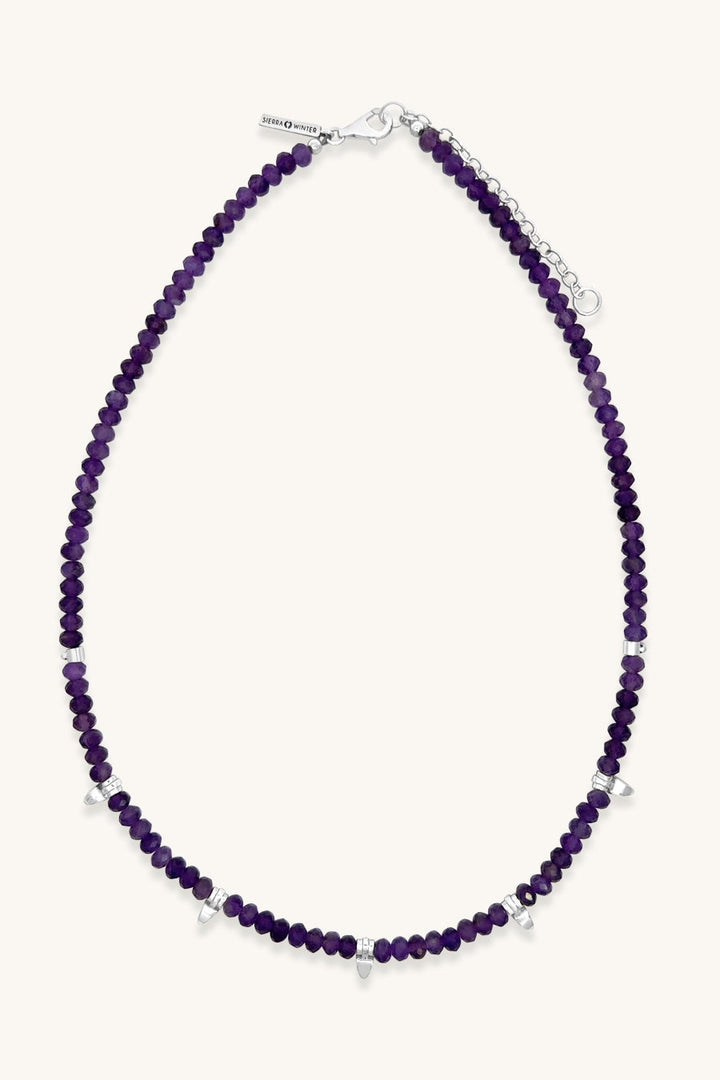 This Megan Necklace by Sierra Winter Jewelry brings soft radiance and spiritual calm to life through the serene beauty of amethyst. Handmade with love and intention, this one-of-a-kind beaded piece celebrates the February birthstone’s connection to clarity, balance, and intuition. Accented in cool sterling silver, it’s a peaceful, thoughtful piece—perfect on its own or layered for a modern boho look.