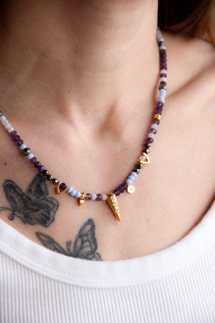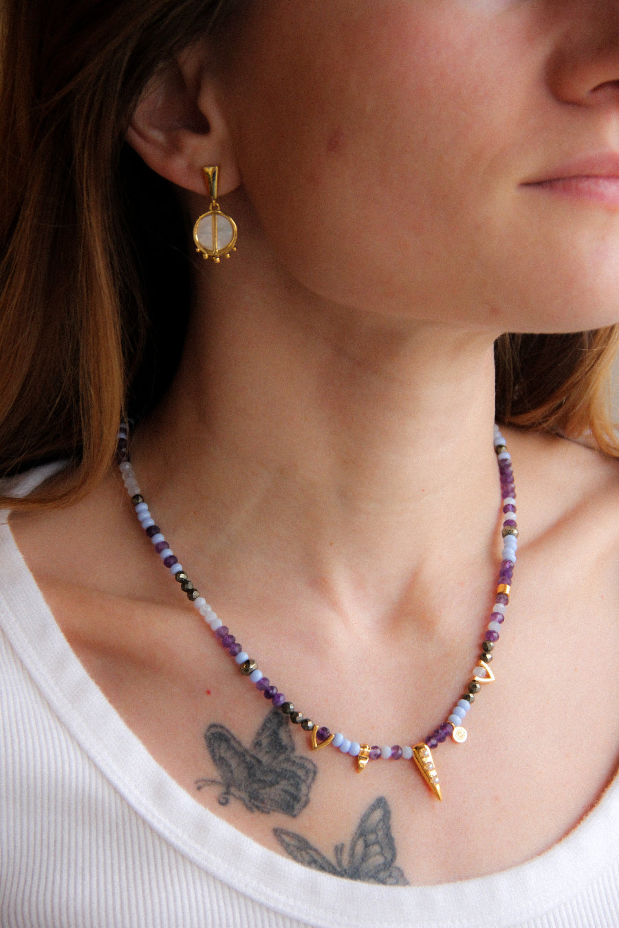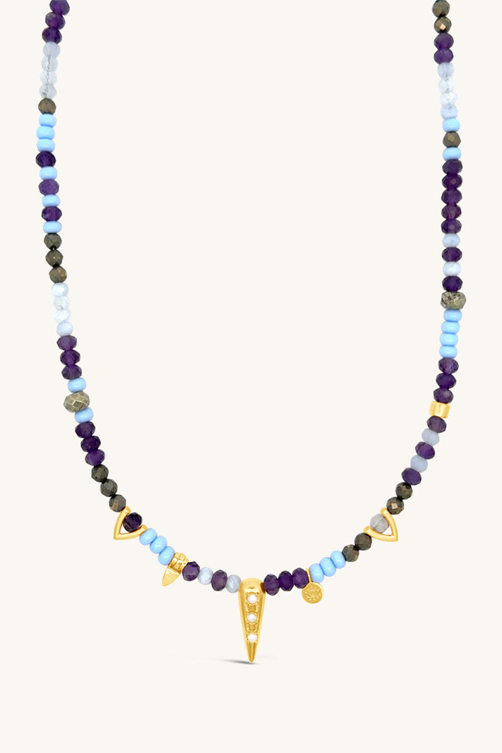 Handcrafted in 18k gold vermeil with semi-precious gemstones: Amethyst, Pyrite, Blue Lace Agate. Adjustable 16–18' length. One-of-a-kind.