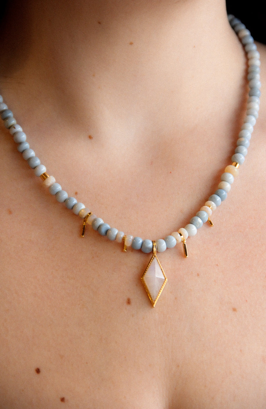 This Punta Cana Necklace by Sierra Winter Jewelry transports you to tropical waters and sun-drenched coastlines. Featuring dreamy blue agate, glowing Australian opal, and rainbow moonstone, this one-of-a-kind piece is a wearable escape. Finished with a bold gold vermeil pendant, it's a radiant reminder to embrace the magic of wanderlust and wonder.
