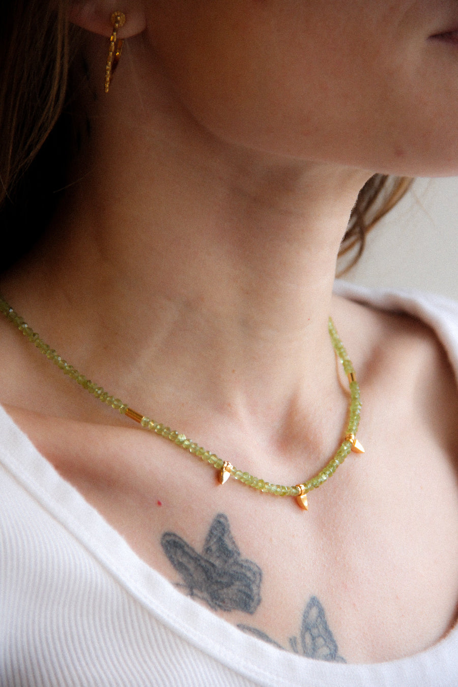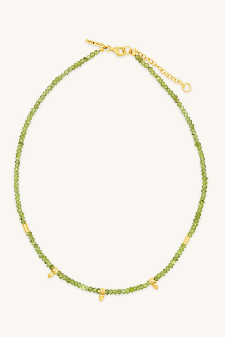 Handcrafted in 18k gold vermeil with semi-precious peridot stones. Adjustable 16–18' length. One-of-a-kind.