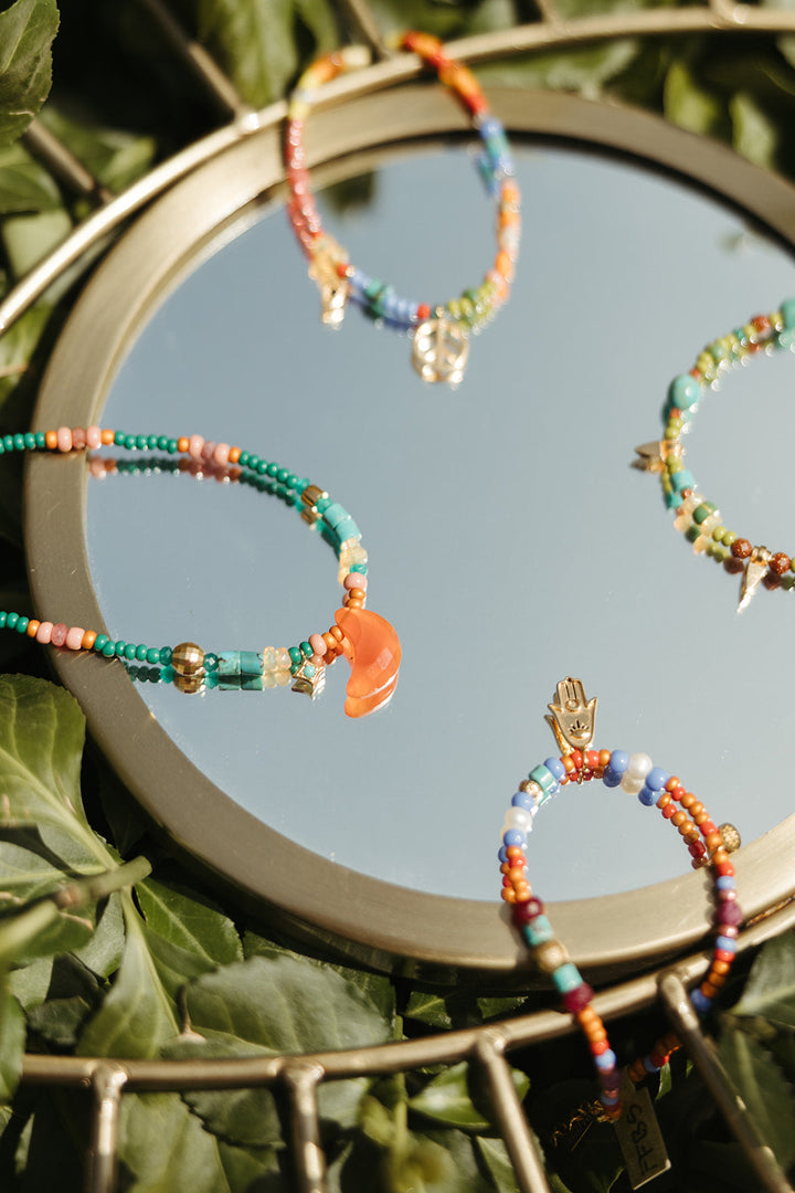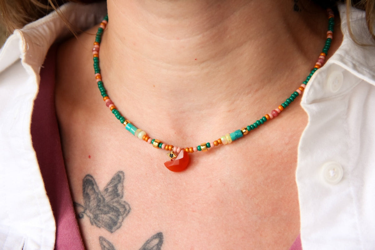 Handcrafted in 18k gold vermeil with semi-precious gemstones: Carnelian, Turquoise, Ethiopian Opal, and Quartz. Adjustable 16–18' length. One-of-a-kind; variations will occur.