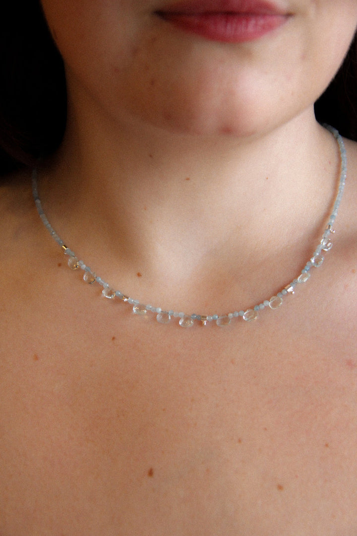 Handcrafted in 18k gold vermeil with semi-precious aquamarine briolette and round beads. Adjustable 16–18' length. One-of-a-kind.
