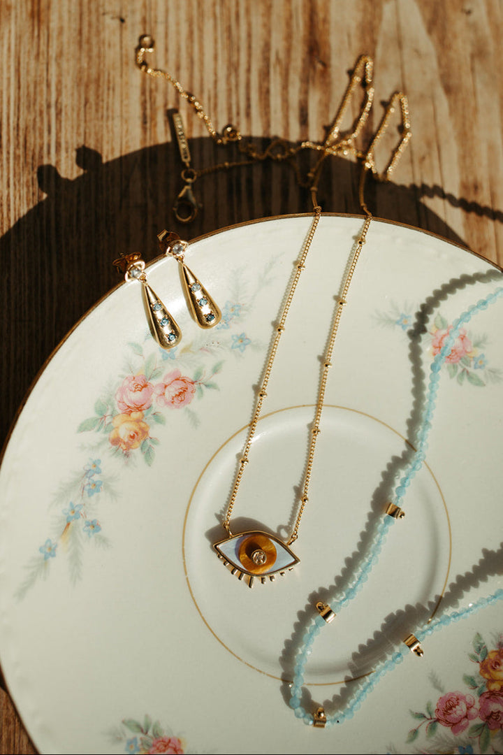 Crafted in 18k gold vermeil with Tiger’s Eye and Mother of Pearl. Adjustable 18–20' length.