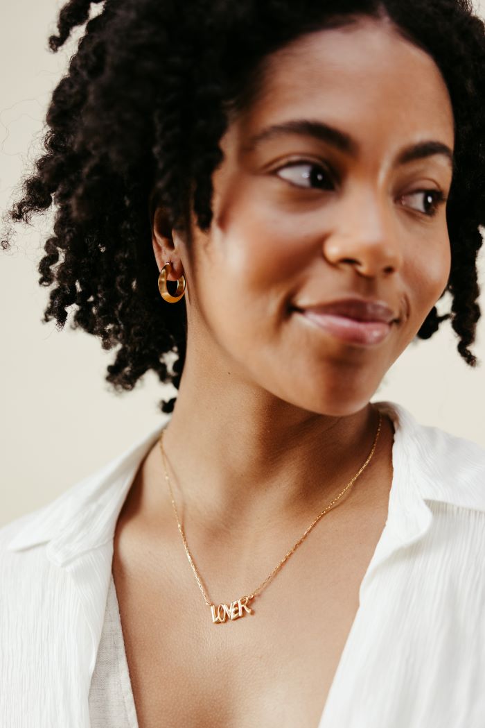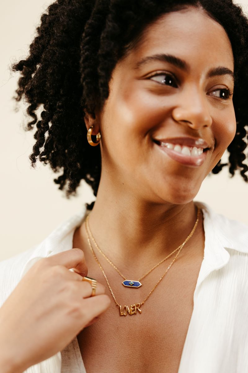 This Love Letters Necklace by Sierra Winter Jewelry is a sparkling self-love mantra in gold script. With its playful bubble lettering and elegant simplicity, this piece says everything you need—loud, proud, and polished. A perfect token of affection for yourself or someone dear.