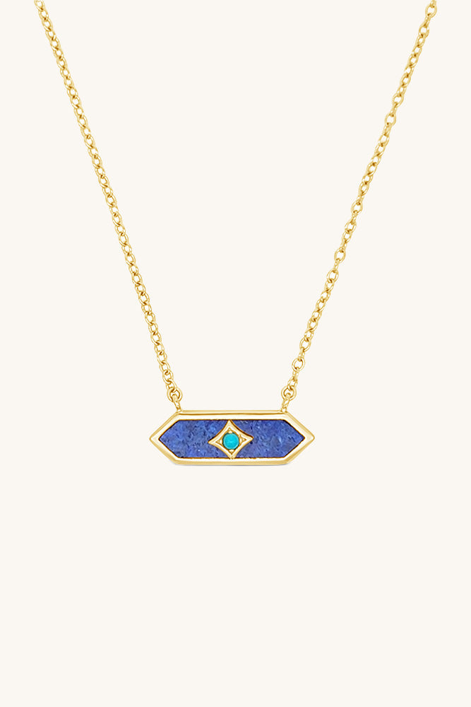 This Catalina Necklace by Sierra Winter Jewelry is a vibrant fusion of ocean blues and desert warmth. A lapis bar pendant dotted with turquoise channels coastal calm and bold expression—like wearing a slice of sky and sea around your neck. Ideal for stacking or spotlighting.