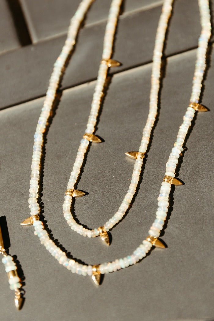 This Mirage Necklace by Sierra Winter Jewelry is a dream in fiery opal and golden light. Ethiopian opals shimmer with warmth and mystery, catching the light like a desert illusion. Ethereal and magnetic, this handcrafted beaded necklace is unforgettable—but handle with care, as these opals are sensitive to moisture.