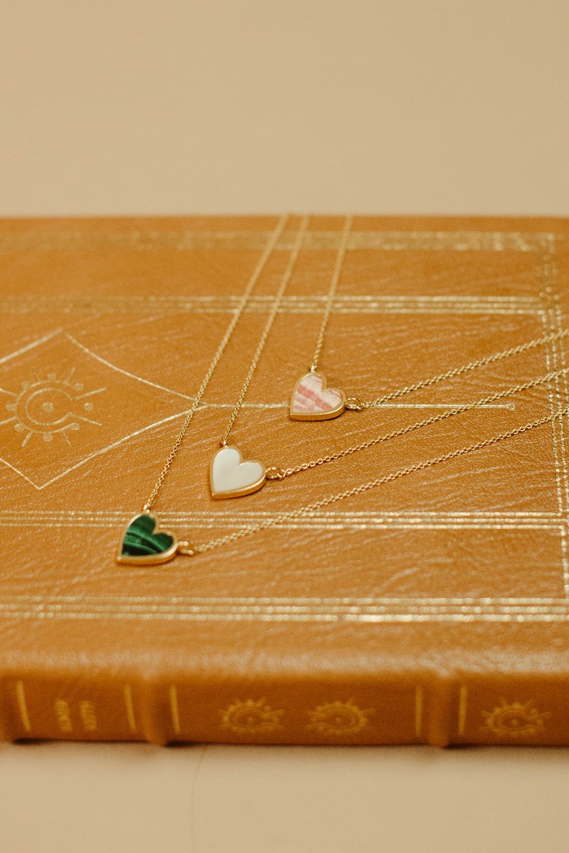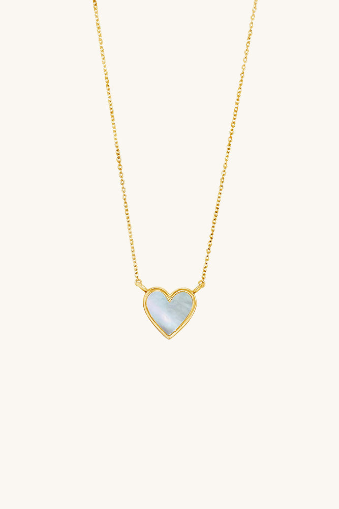 This Lovestruck Necklace by Sierra Winter Jewelry in mother of pearl offers a luminous twist on the beloved heart motif. Its soft iridescence reflects feminine beauty and emotional clarity, while the tattoo-inspired design on the reverse adds a modern edge. A symbol of tenderness and fierce love.