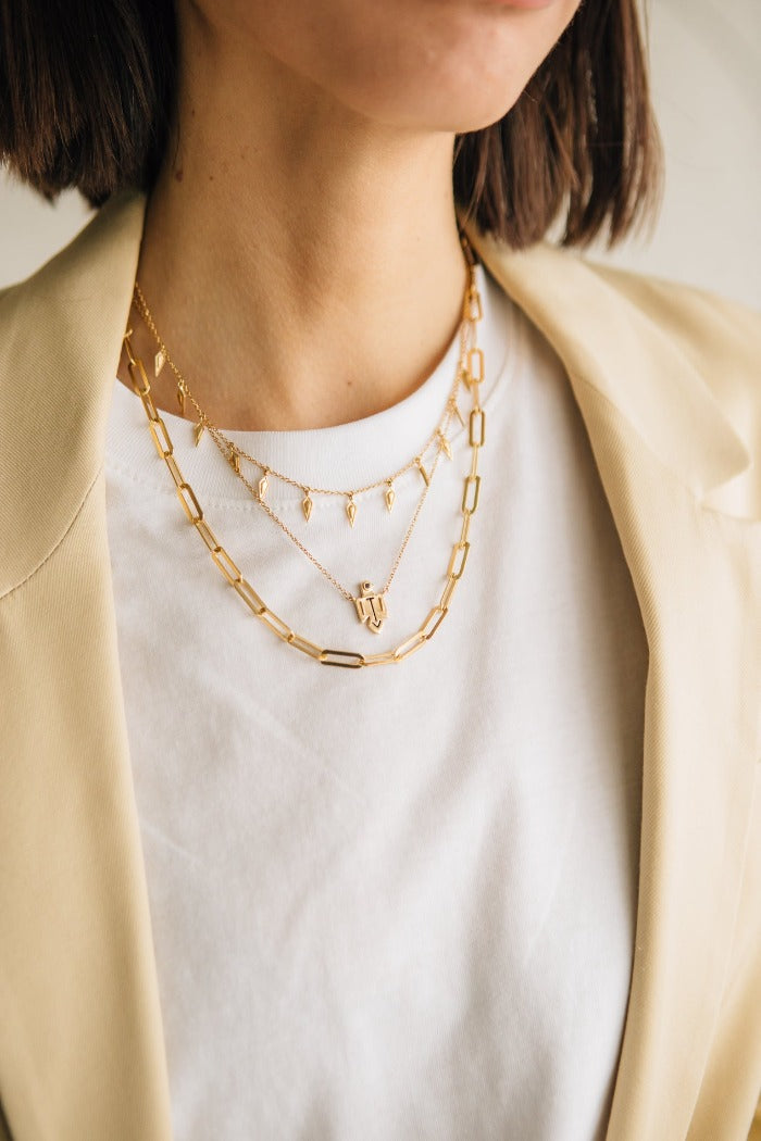This Wildfire Necklace in Gold by Sierra Winter Jewelry flickers with playful energy and subtle movement. Featuring kite-shaped dangles that resemble tiny flames, this dainty necklace is designed to add texture and warmth to your layers. It’s an effortless way to bring a little fire to your everyday style.