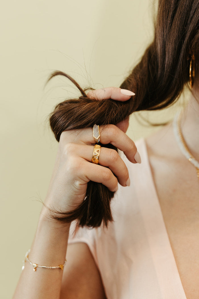This Good Fortune Ring in Gold by Sierra Winter Jewelry is your modern talisman—a bold band ring etched with positivity and adorned with symbols of luck and protection. Inscribed with “YOUR FUTURE LOOKS BRIGHT,” this piece is both a style statement and a mantra to carry forward. Its chunky form and radiant finish make it a powerful addition to any ring stack or worn solo for impact.