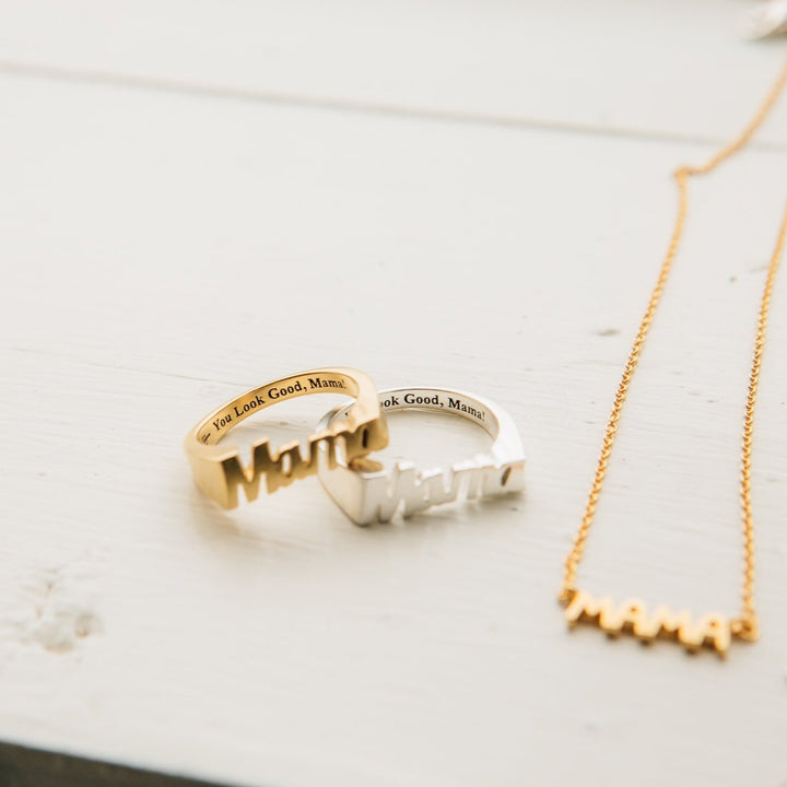 This Mama Ring - Gold by Sierra Winter Jewelry is a glowing tribute to the powerful role of motherhood. With bold simplicity and an empowering message—‘You Look Good, Mama!’—this ring is a wearable affirmation for mamas who do it all. A celebration of strength, beauty, and self-love, it’s designed to honor life-givers with a luxurious gold glow.