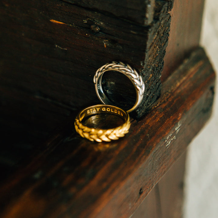 Crafted in 18k gold vermeil. Band inscribed with ‘STAY GOLDEN’. Available in sizes 6, 7, 8, 9.