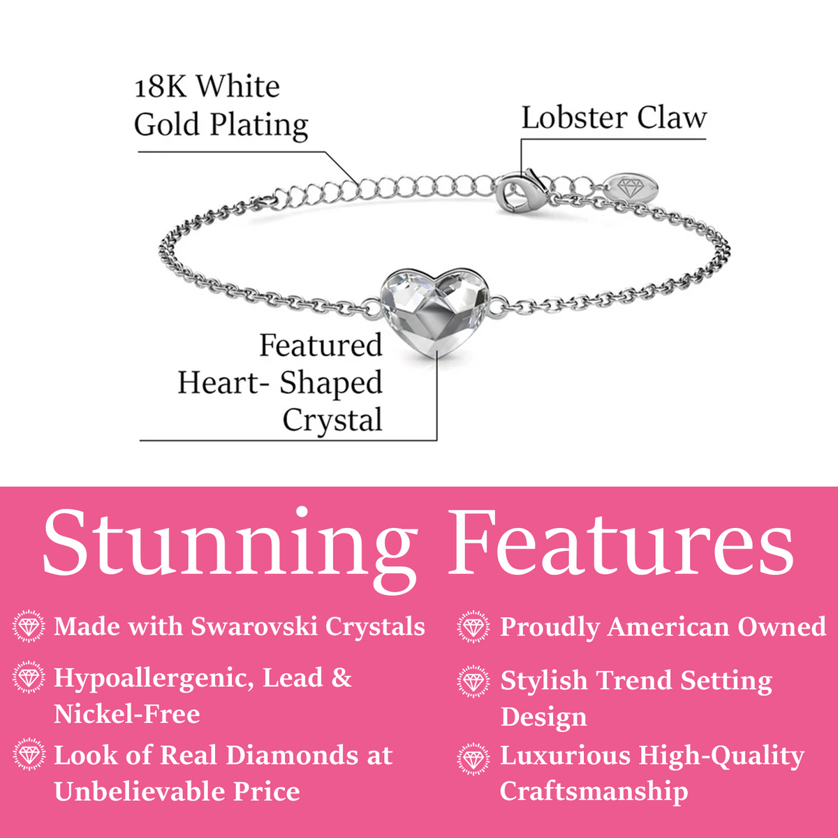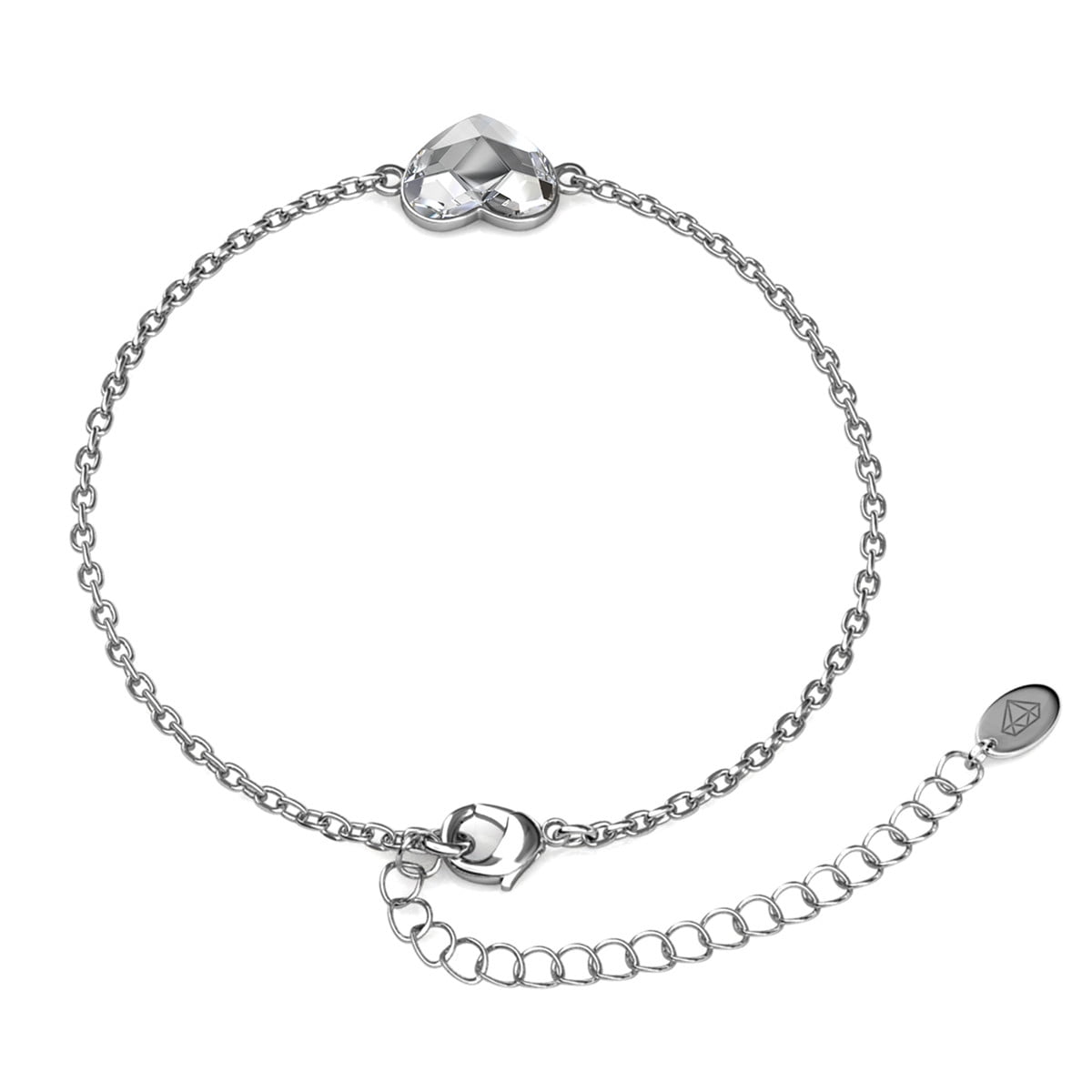Crafted in 18k White Gold Plated brass. Adorned with 1 heart-shaped Swarovski crystal. Closure: Lobster claw. Hypoallergenic, lead & nickel free. Includes C&C branded jewelry gift box.