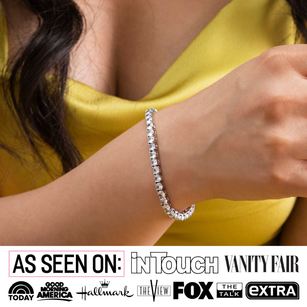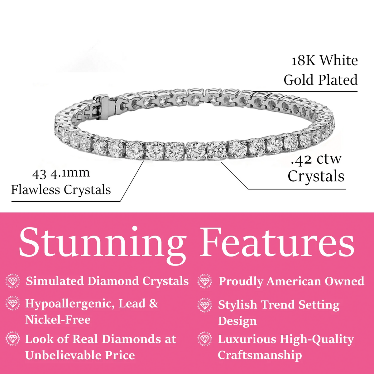 Crafted in 18k White Gold Plated brass. Set with 43 round-cut simulated diamond crystals (4.1mm). Length: 7.5'. Closure: Tongue clasp. Hypoallergenic, lead-free, nickel-free. Includes C&C branded gift box.