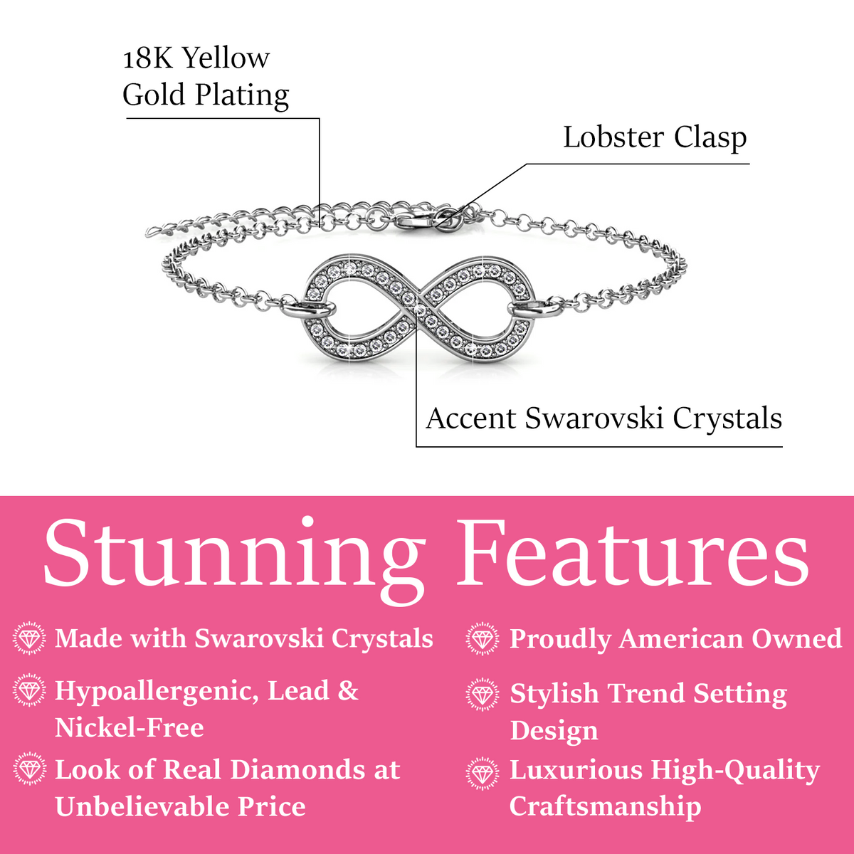 Style Notes: This Morgan Infinity Bracelet by Cate & Chloe captures the eternal nature of love and style. Featuring 31 round-cut Swarovski crystals arranged in a shimmering pattern, this bracelet blends delicate design with symbolic charm. Ideal for layering or worn solo, Morgan delivers versatile sophistication.