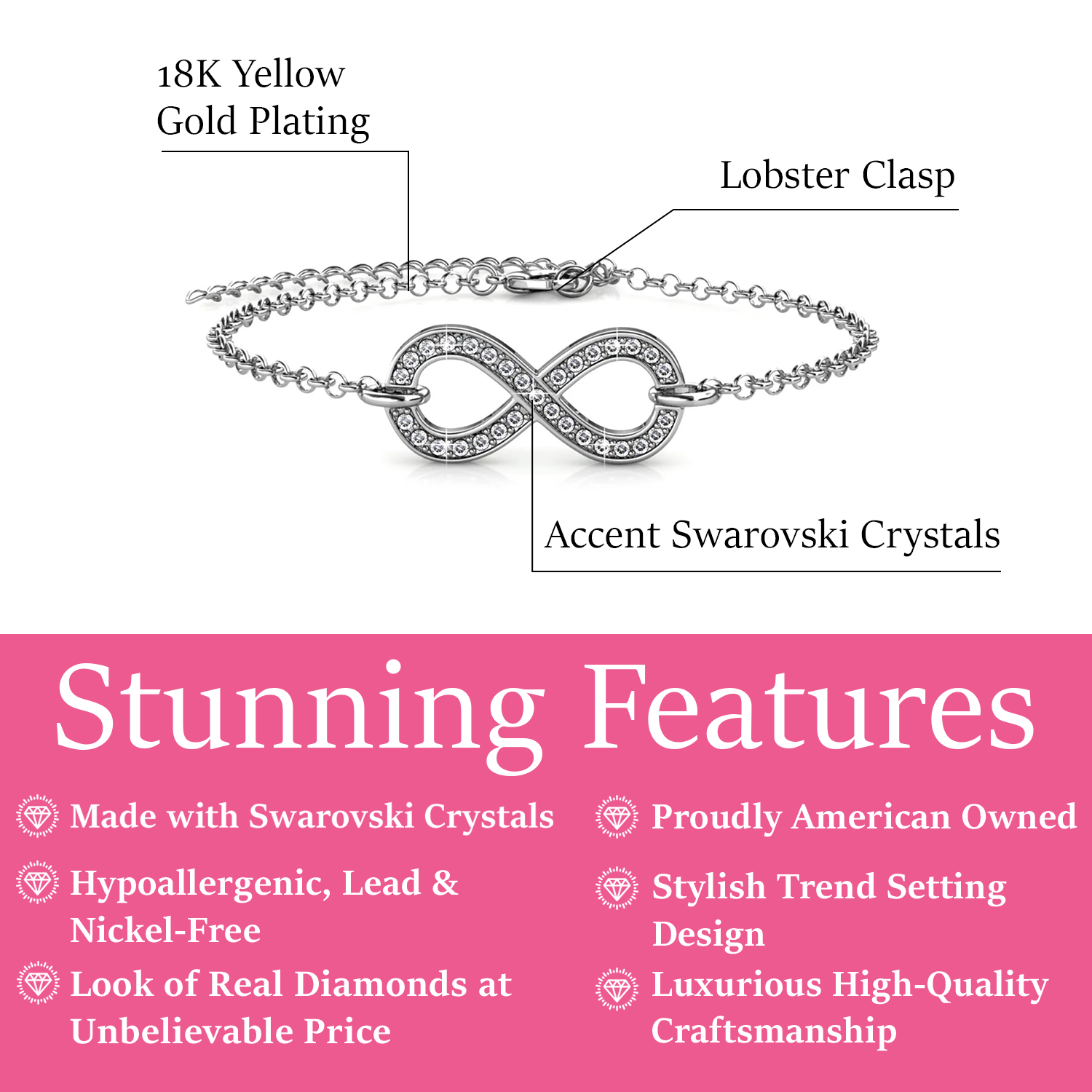 Materials: Crafted in 18k White Gold Plated brass. Set with 31 round-cut Swarovski crystals. Closure: Lobster claw. Hypoallergenic, lead-free, nickel-free. Includes C&C branded jewelry gift box.
