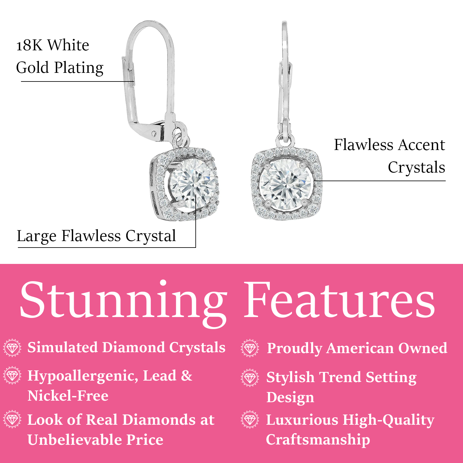 Handcrafted in 18k white gold plated brass with simulated diamond crystals and Swarovski® accents. Lever back closure. Lead- and nickel-free.