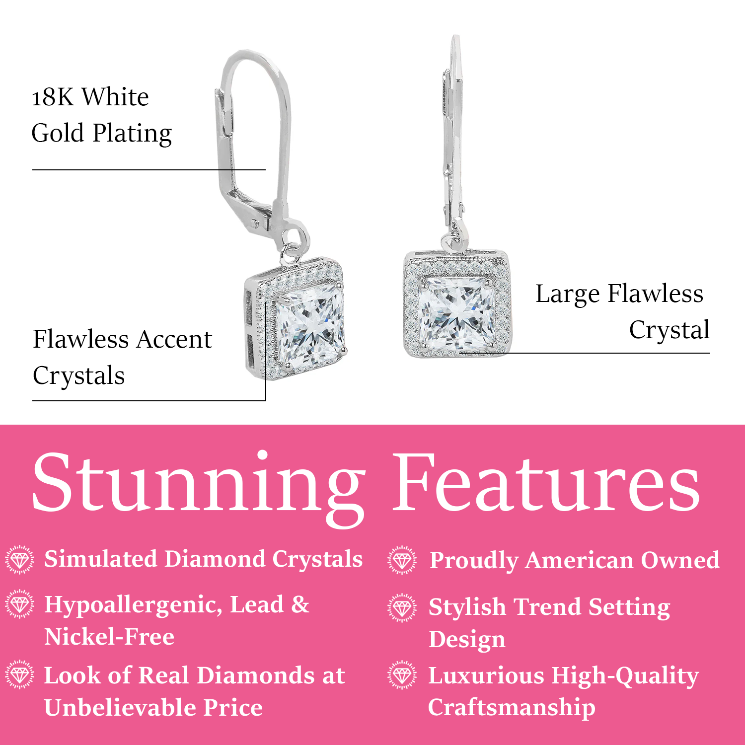 Handcrafted in 18k white gold plated brass with simulated diamond crystals. Lever back closure. Lead- and nickel-free.