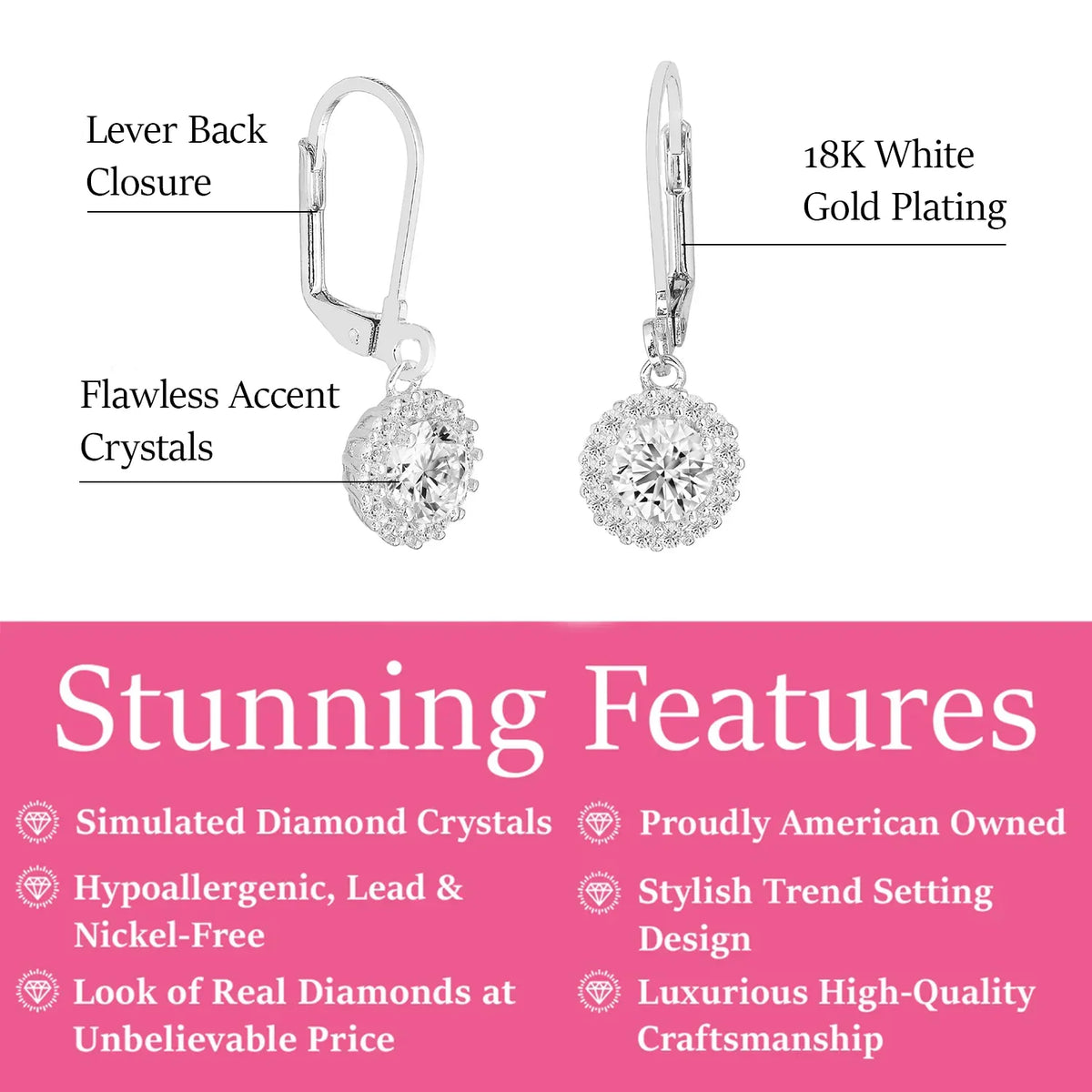 Handcrafted in 18k white gold plated brass with simulated diamond crystals. Lever back closure. Lead- and nickel-free.