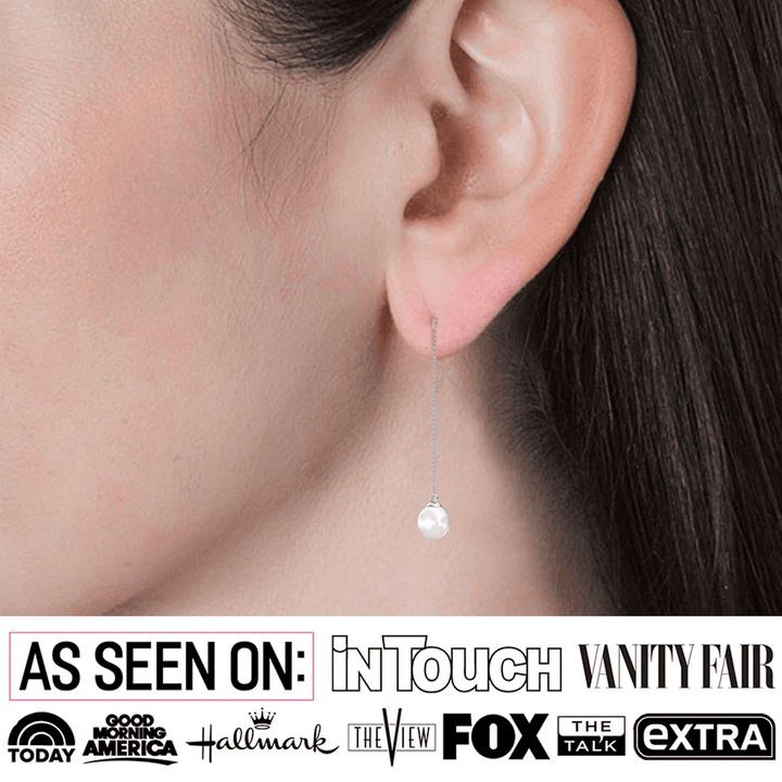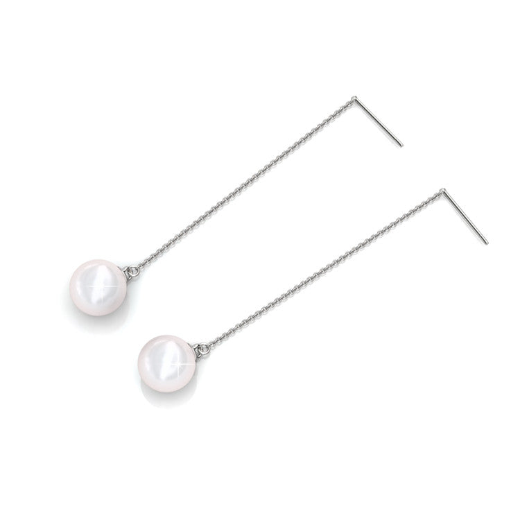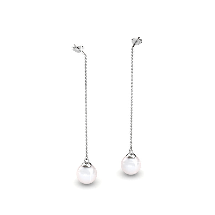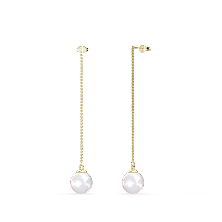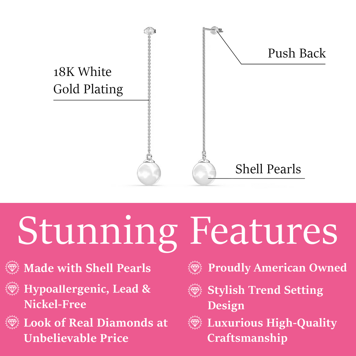 These Aspen 18k White Gold Plated Dangle Earrings with Shell Pearls by Cate & Chloe offer classic beauty in a refined silhouette. Featuring two luminous 8mm pearls and a dramatic 60mm drop, these earrings sway with poise and grace—an elegant choice for polished sophistication.