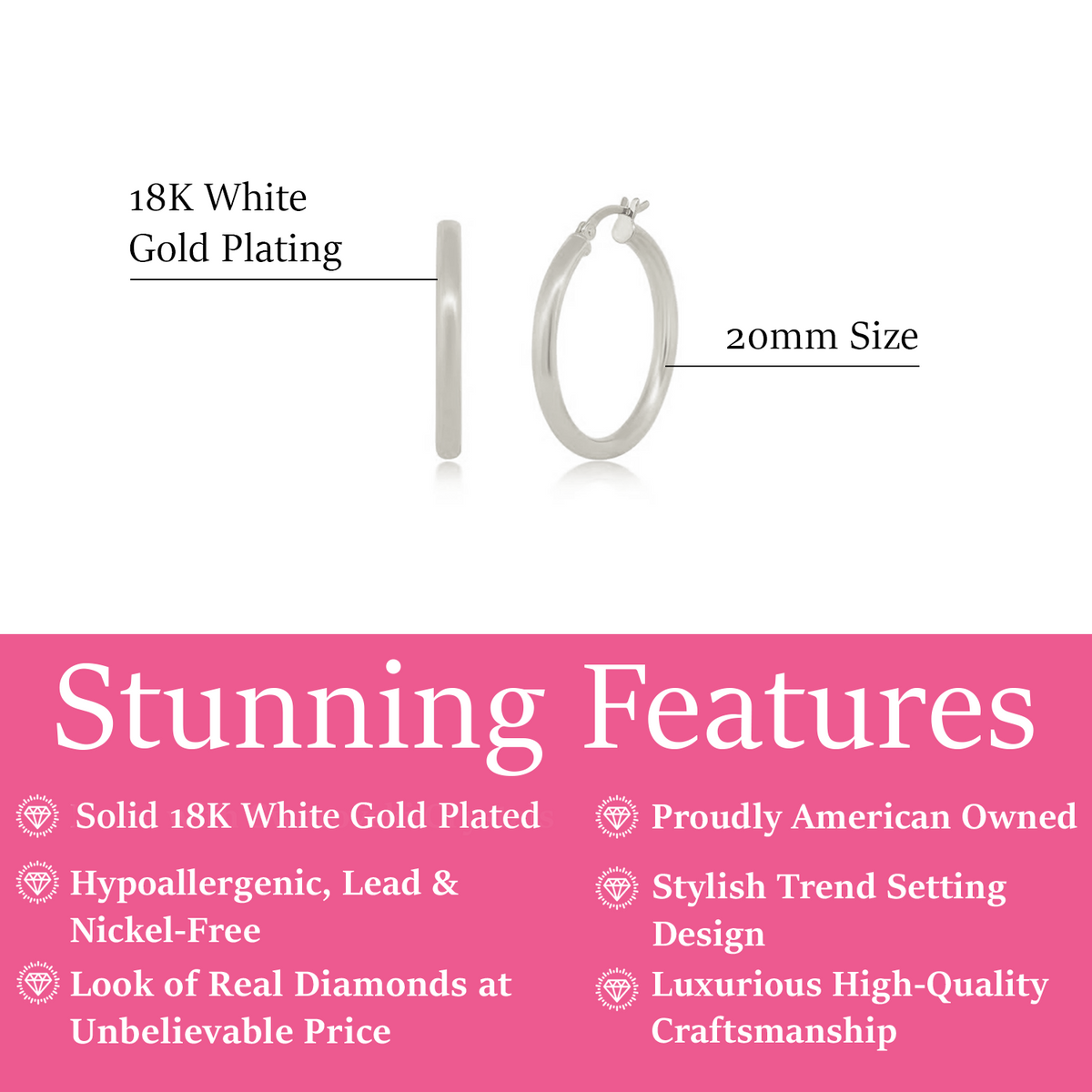 These Amy 18k White Gold Plated 20mm/30mm Hoop Earrings by Cate & Chloe are crafted for versatility and impact. With a clean silhouette and polished finish, they make the perfect accessory for both minimalist and bold styling—elegant gifts that work with every wardrobe.