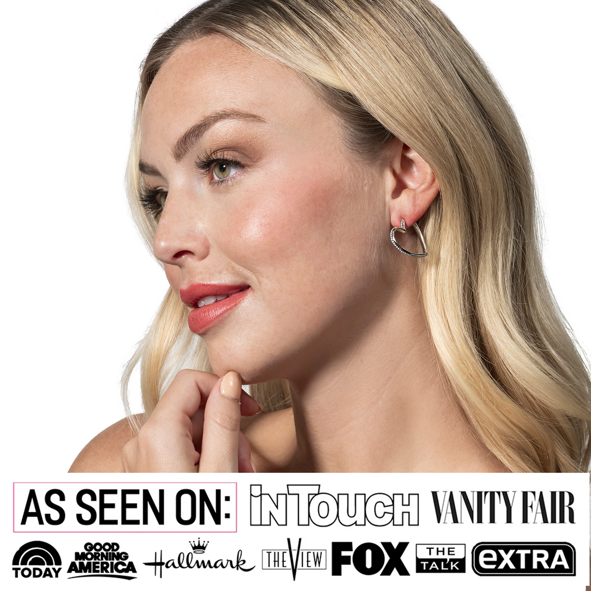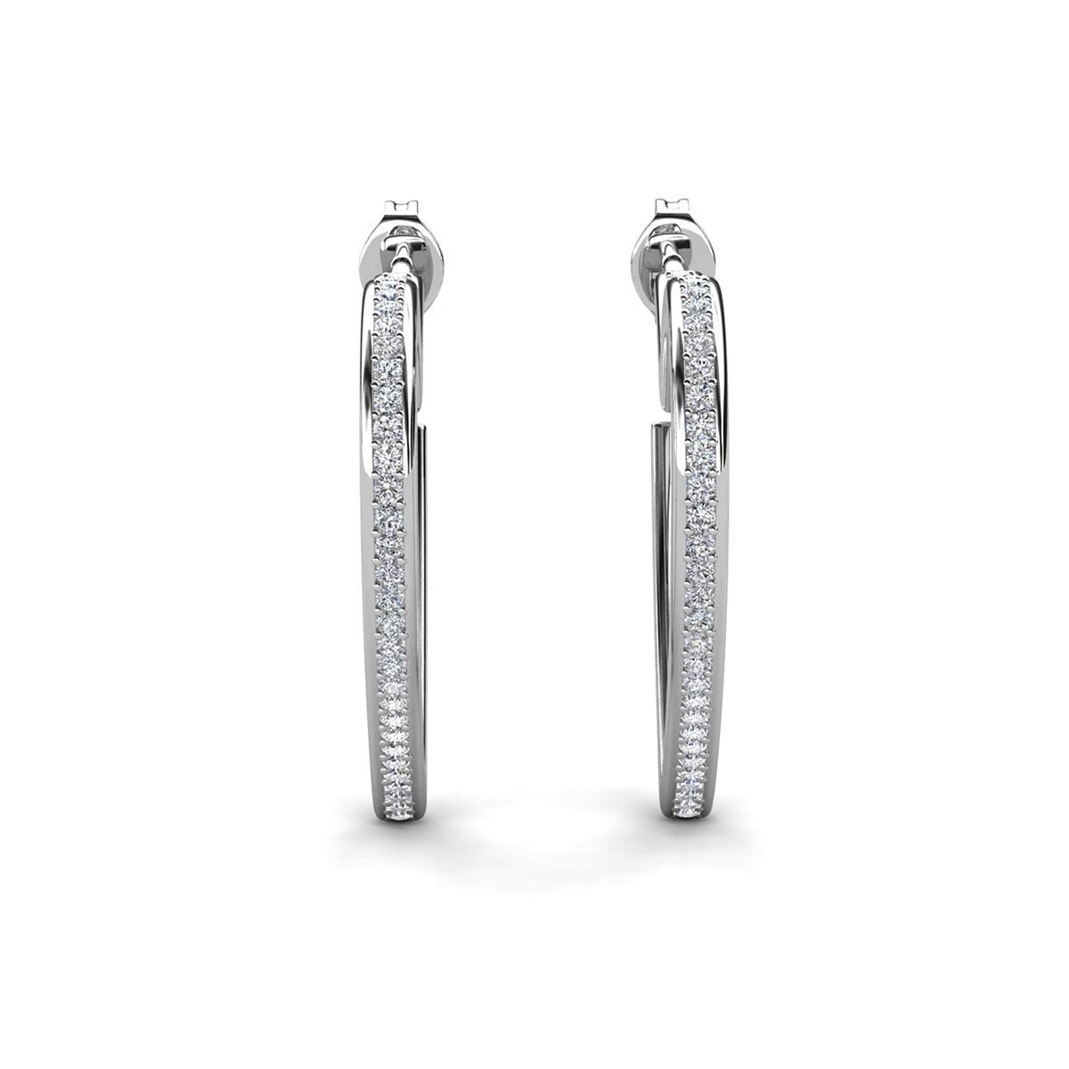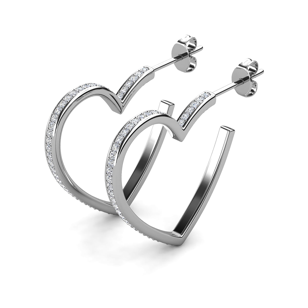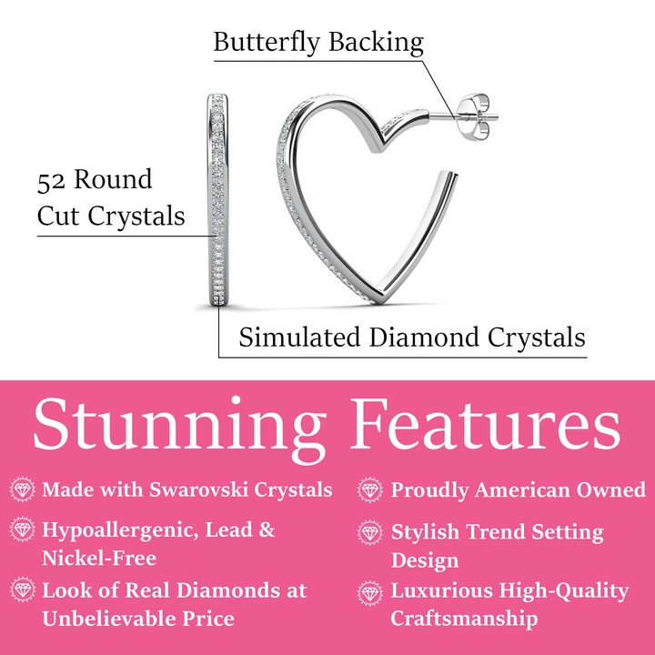Handcrafted in 18k white gold plating over brass with Swarovski® crystals. 25mm heart hoops. Push back closure. Hypoallergenic, lead- and nickel-free.