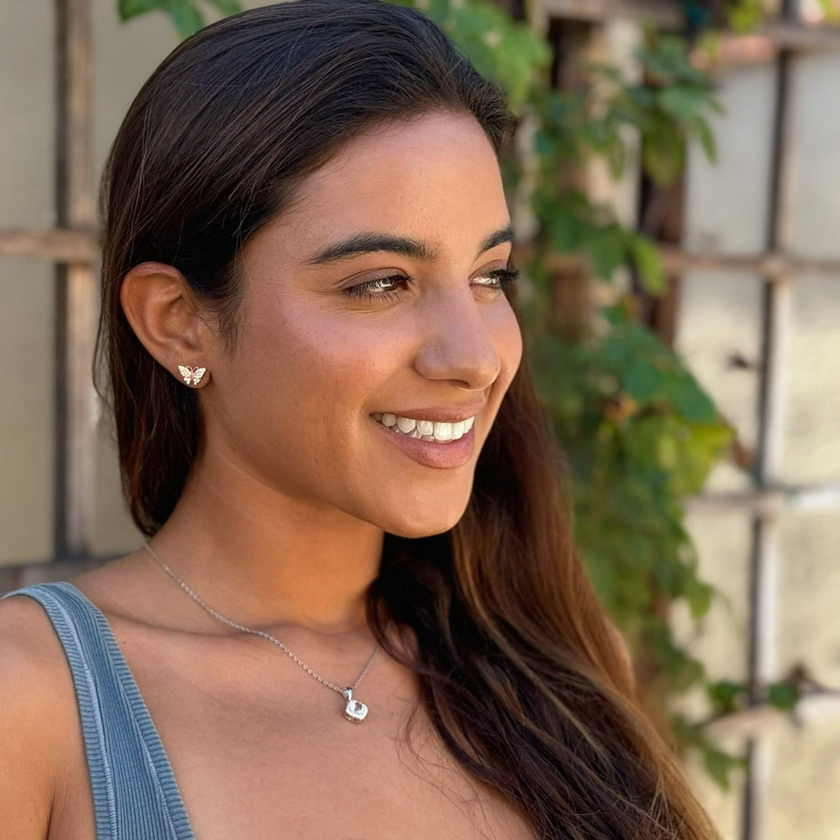 These Everlee 18k White Gold Plated Butterfly Stud Earrings by Cate & Chloe are delicate, playful, and radiant. Embellished with shimmering Swarovski® crystals, they bring a touch of whimsy and charm—perfect for adding a graceful sparkle to your ensemble.
