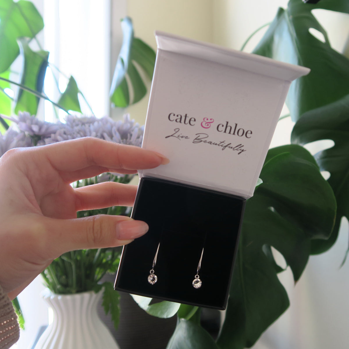 These Veronica Drop Earrings by Cate & Chloe are a sophisticated statement for the modern woman. Crafted in sterling silver and plated in 18k white gold, the design features a sparkling round Swarovski stone in a classic drop silhouette — ideal for a polished, timeless look.