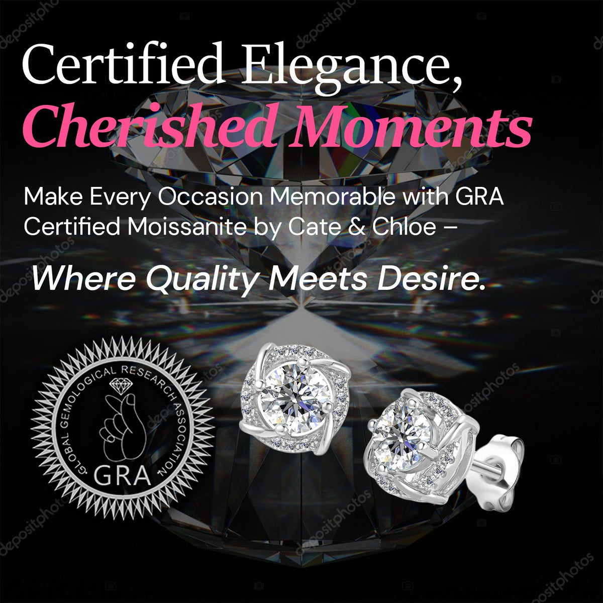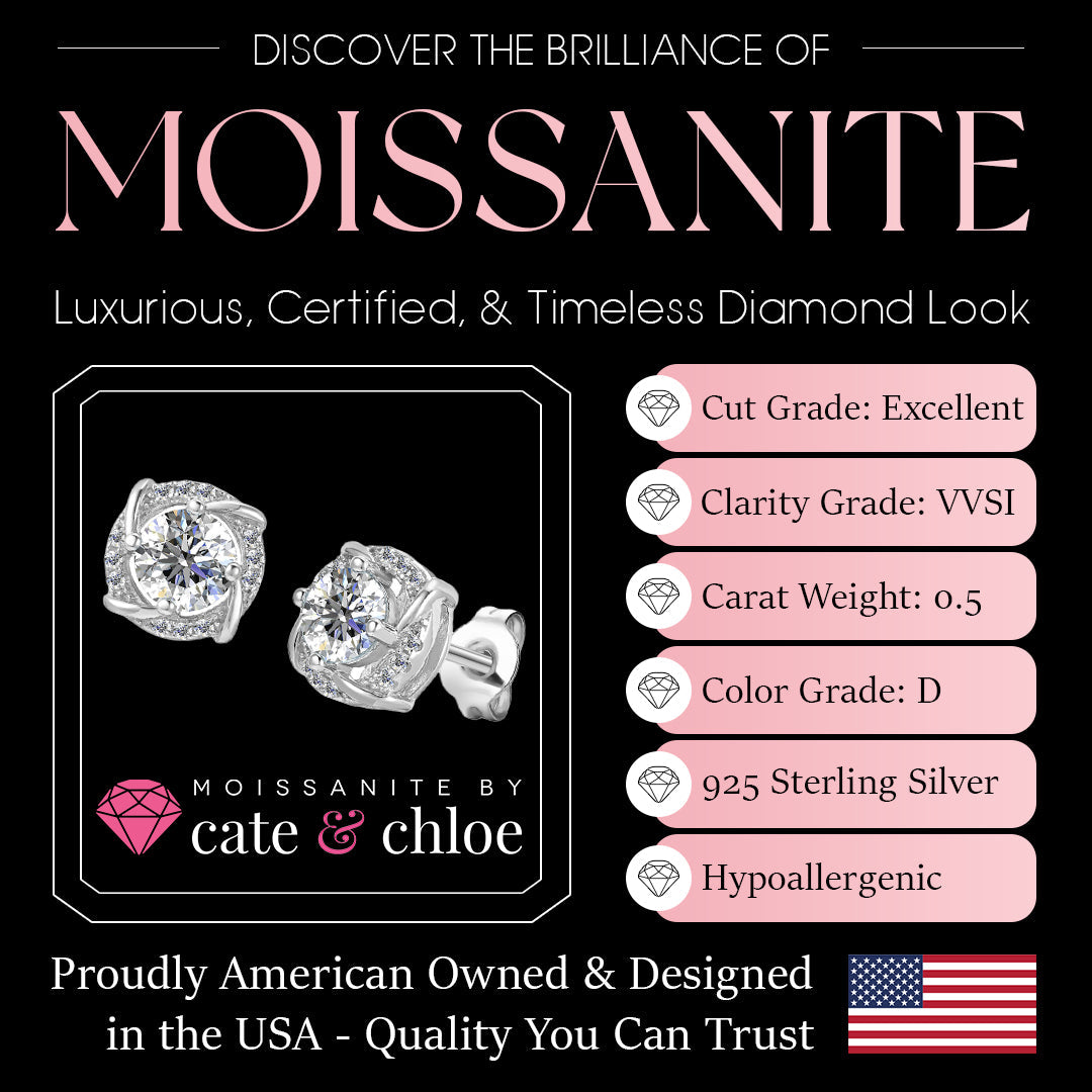 These Jemma Stud Earrings by Cate & Chloe from the Moissanite Signature Collection are a refined expression of luxury. With a 1ctw brilliance and a halo of accent stones, these sterling silver studs deliver timeless sparkle, exceptional fire, and certified quality in every wear.