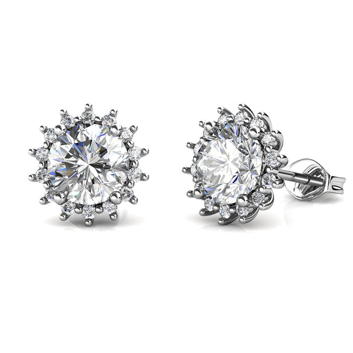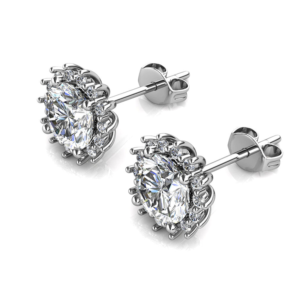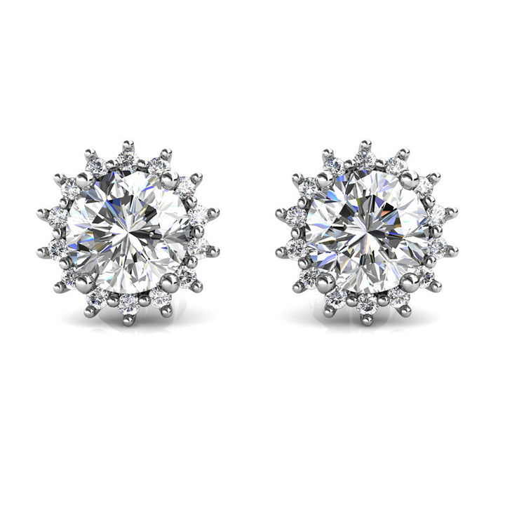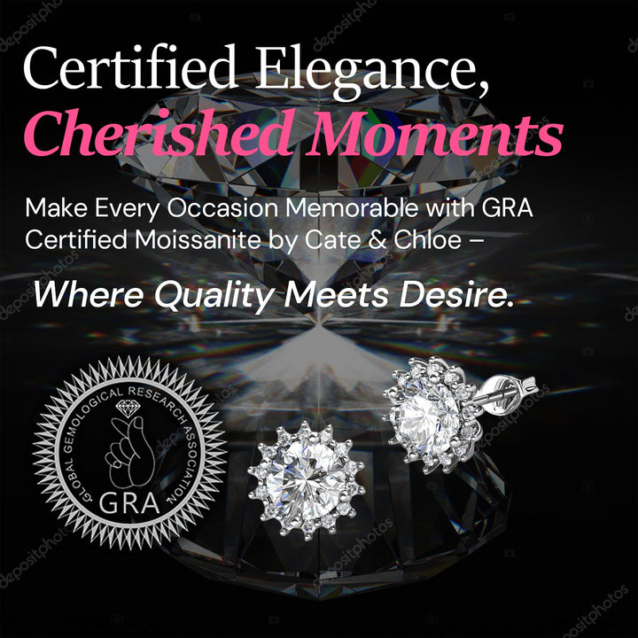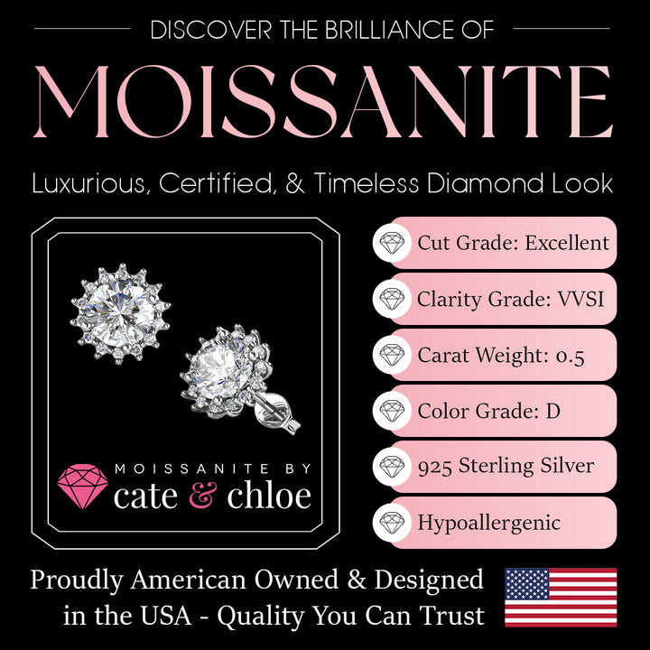 These Starla Stud Earrings by Cate & Chloe are stunning halo earrings designed for luminous simplicity. Featuring brilliant Moissanite center stones surrounded by 28 accent stones, Starla offers refined sparkle and heirloom-level charm with every wear.