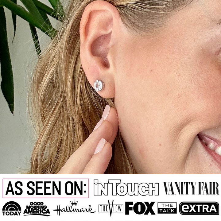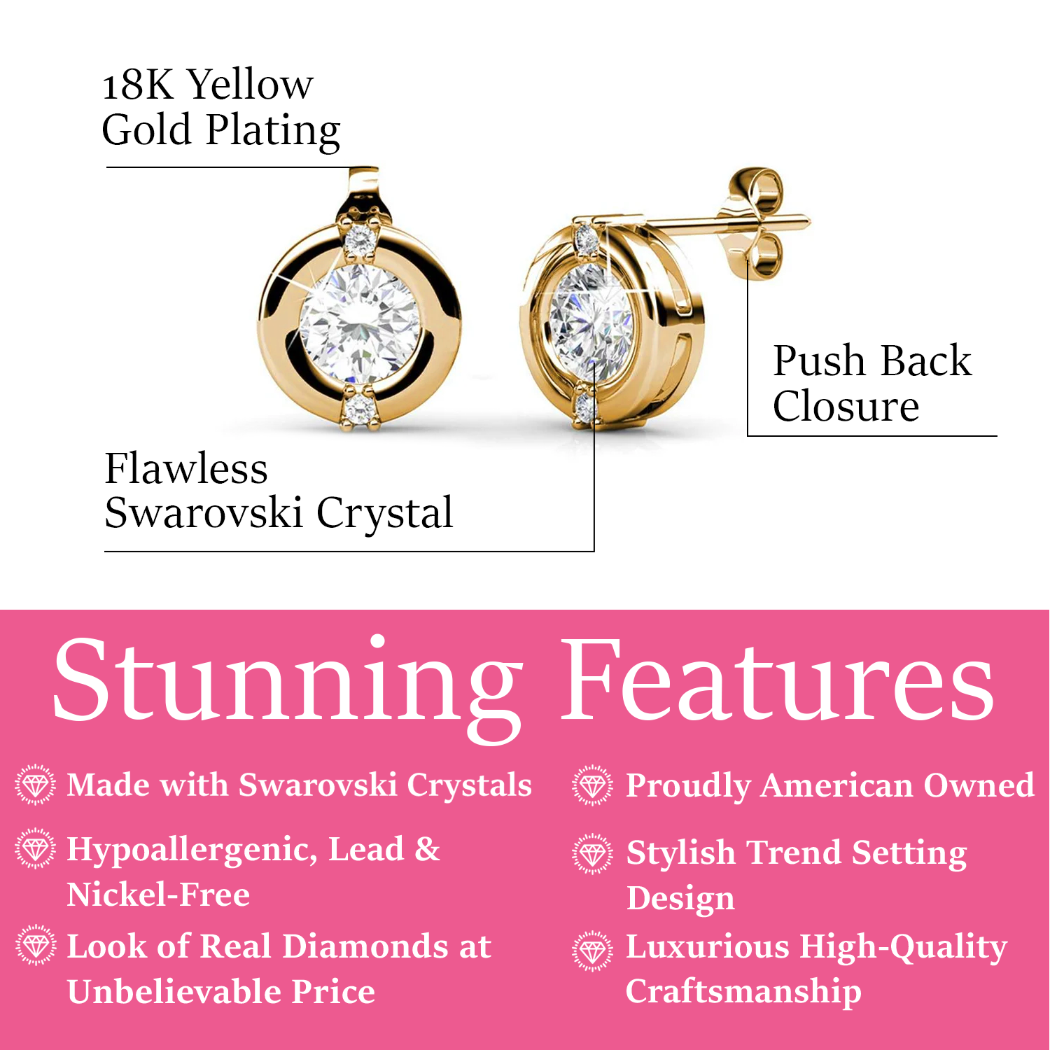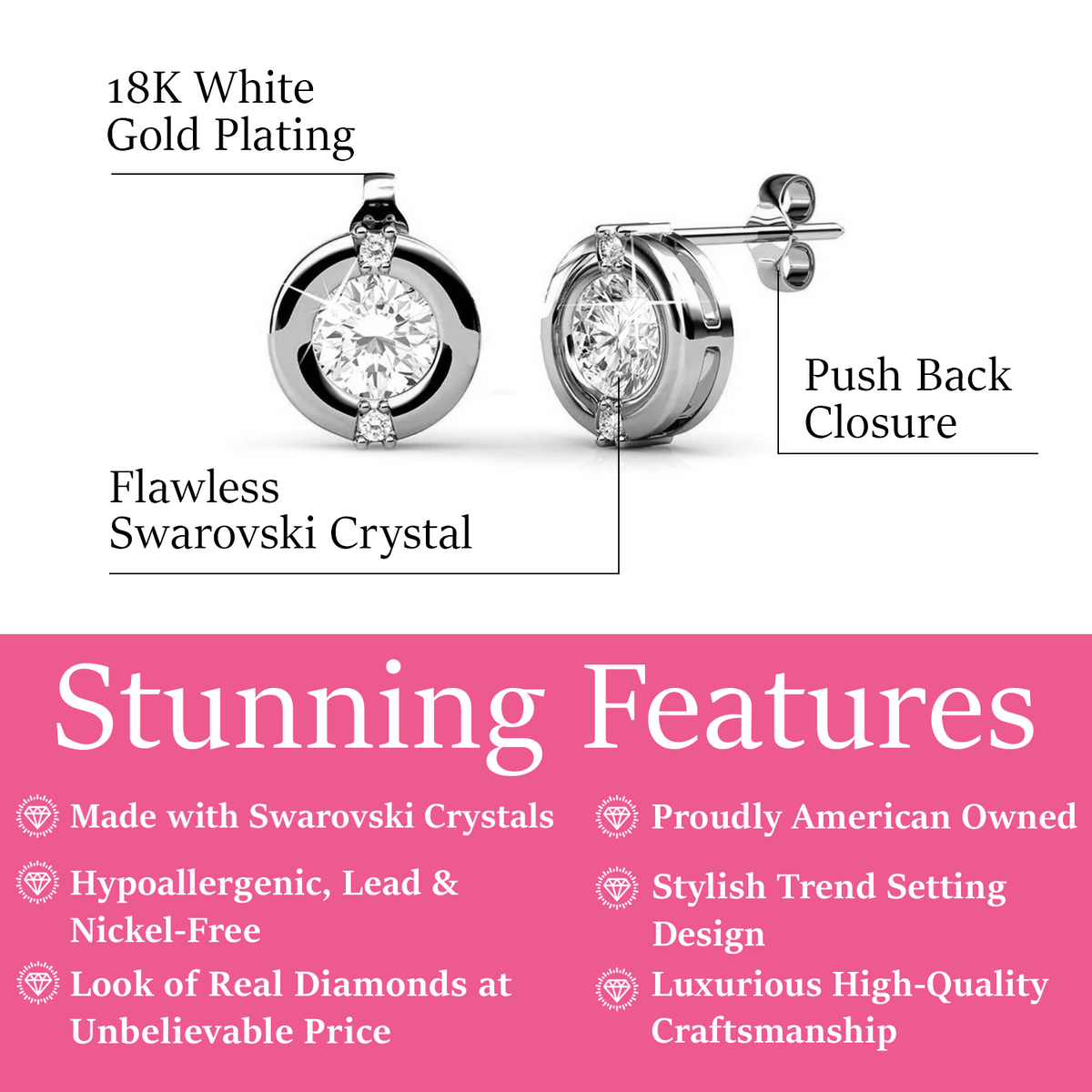 Plated in 18k White Gold with 1 featured 5mm Swarovski Crystal and 2 accent crystals at 1.5mm each. Dimensions: 8mm x 8mm. Backing: Push back. Base metal: Brass. Hypoallergenic, lead & nickel free. Includes C&C branded gift box.