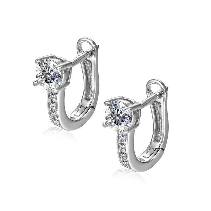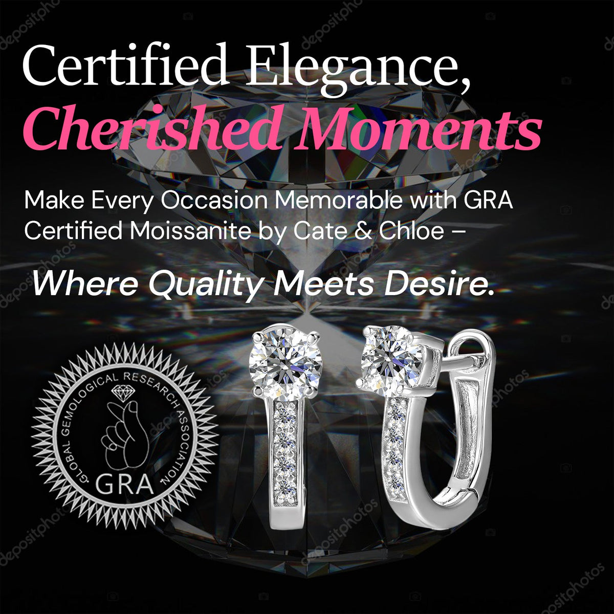 Crafted in 925 Sterling Silver with 18k White Gold Plating. Set with 2 moissanite stones (0.5ct / 5mm each) and 8 accent stones. Dimensions: 13mm x 13mm. Backing: Latch back. Hypoallergenic, lead-free, nickel-free. Includes luxury jewelry gift box and GRA Moissanite Certification with Warranty ID Card.