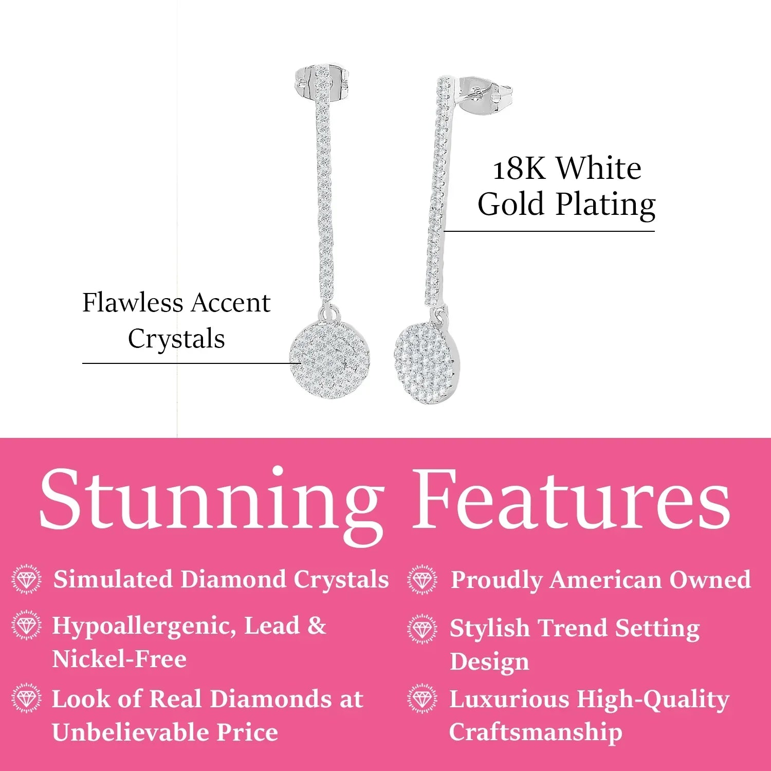 Crafted in 18k White Gold Plated brass. Set with 118 round-cut simulated diamond crystals. Backing: Push back. Hypoallergenic, lead-free, nickel-free. Includes C&C branded gift box.