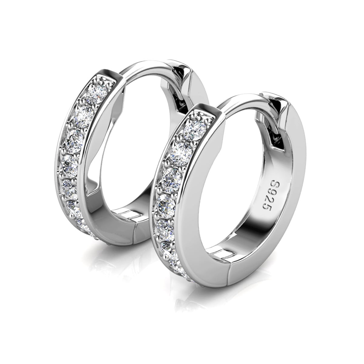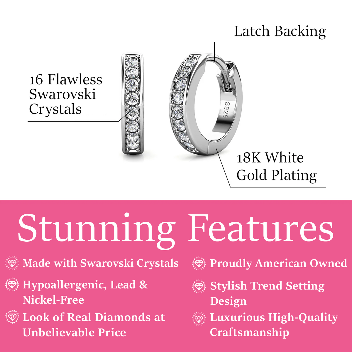 Crafted in 18k White Gold Plated brass. Set with 16 round-cut Swarovski crystals. Diameter: 12mm. Backing: Latch back. Hypoallergenic, lead-free, nickel-free. Includes C&C branded jewelry gift box.
