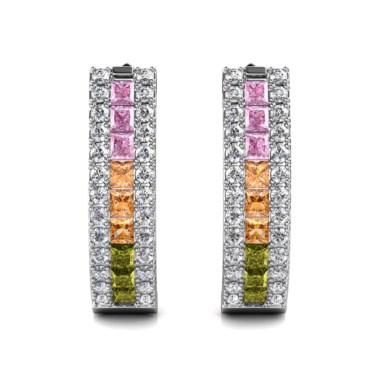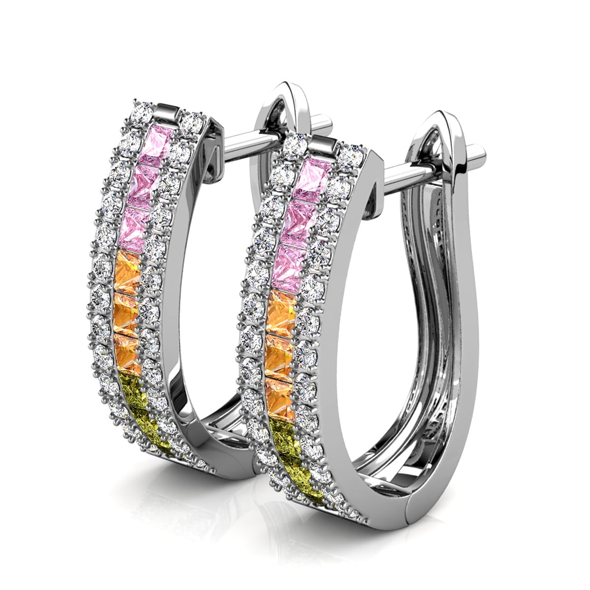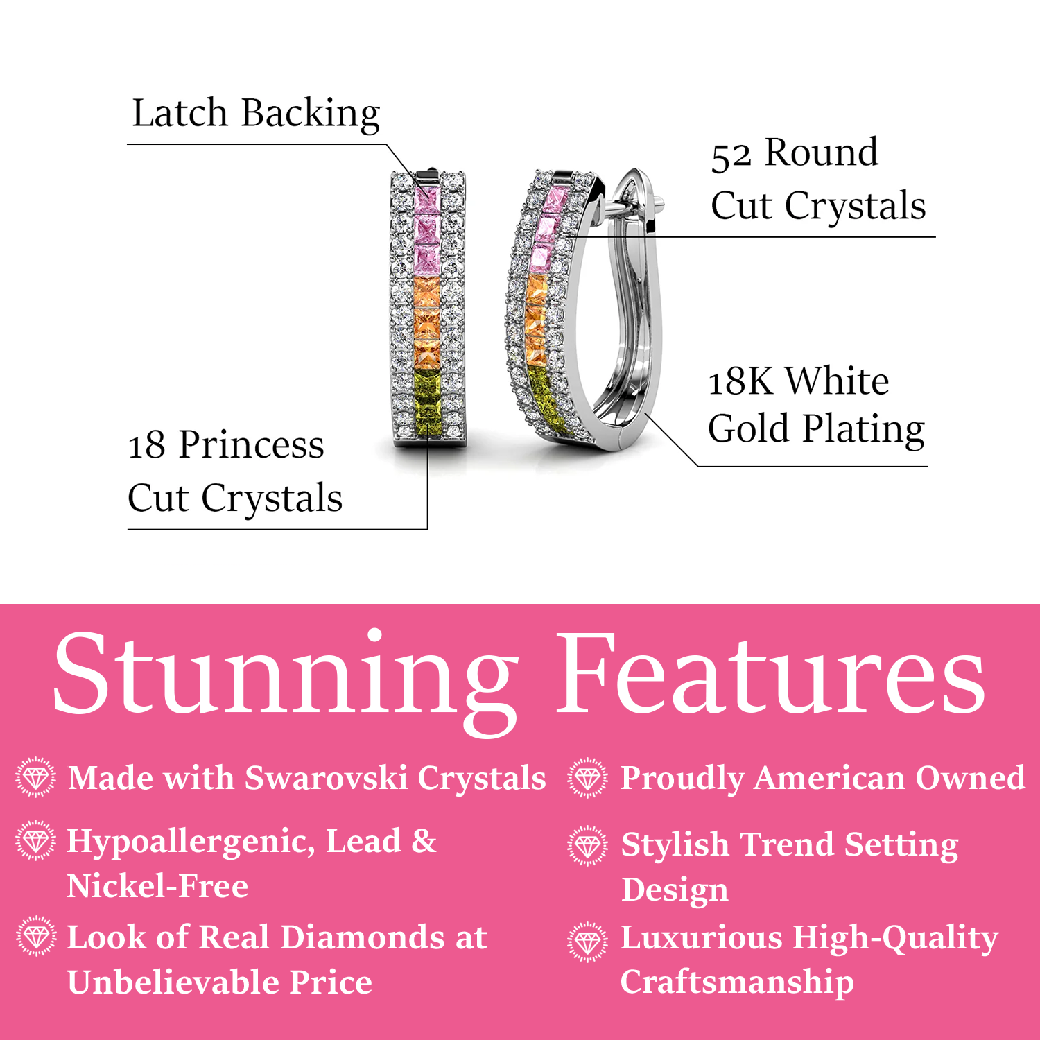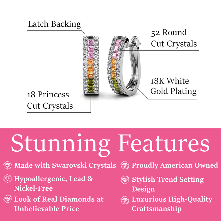 Crafted in 18k White Gold Plated brass. Set with 18 princess-cut and 52 round-cut Swarovski crystals. 19mm hoop diameter. Backing: Latch back. Hypoallergenic, lead-free, nickel-free. Includes C&C branded jewelry gift box.