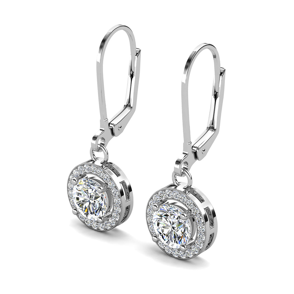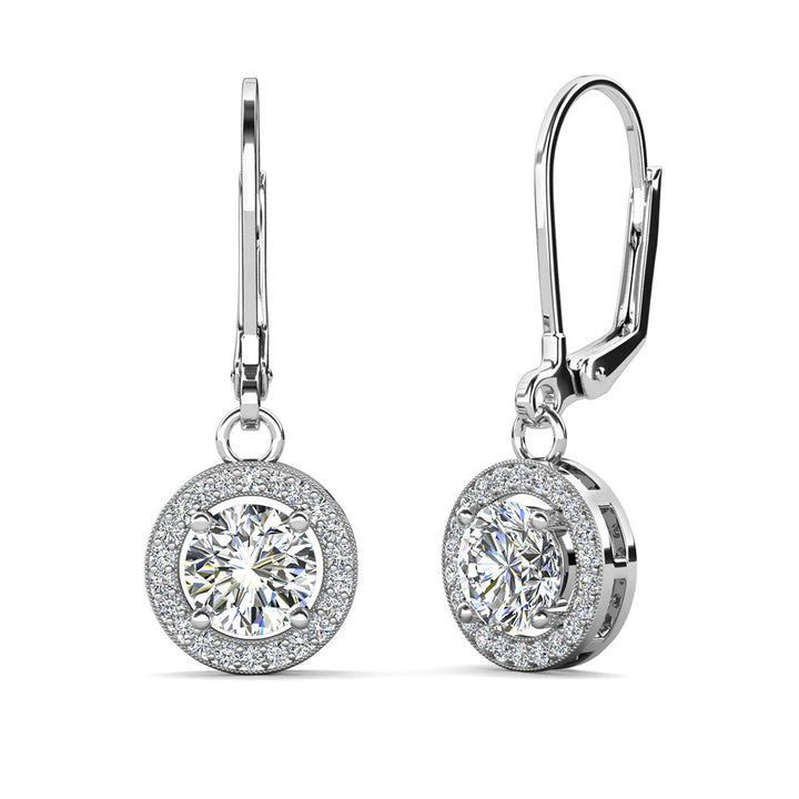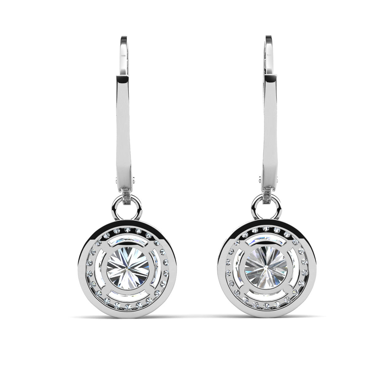 These Juliana Halo Dangle Earrings by Cate & Chloe are a radiant ode to sophistication. Featuring 2 large 7.4mm round-cut simulated diamond crystals surrounded by 44 accent stones, the halo setting maximizes brilliance while the lever-back design offers both elegance and ease. Ideal for special occasions or adding drama to everyday style.